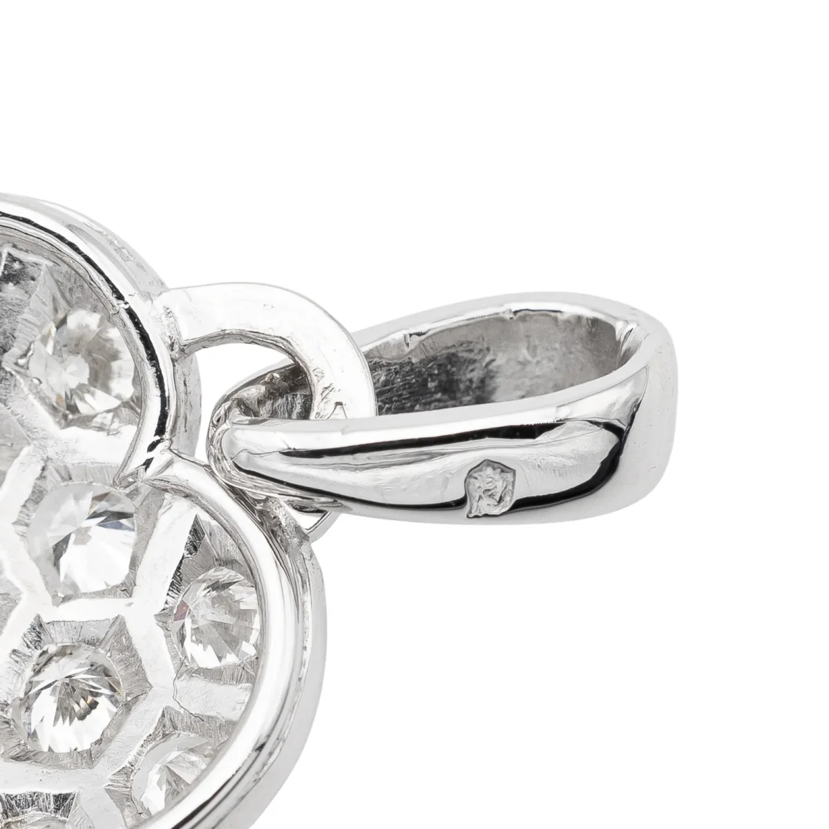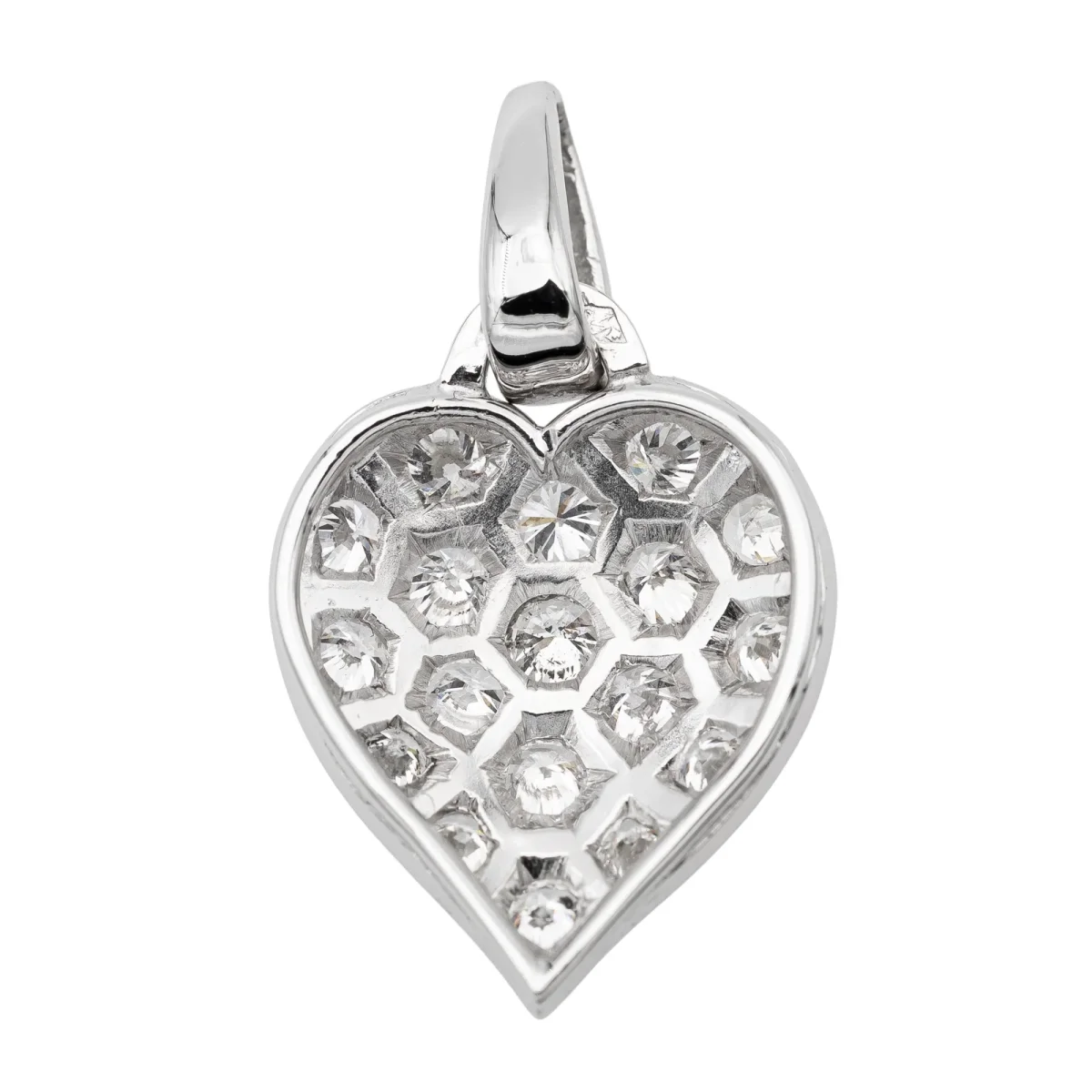 Pendentif coeur serti de diamants, en or blanc 750 millièmes (18 carats), 17 diamants taille brillant, environ G-SI, d’un poids total d’environ 0,51 ct, (chaque diamant d’un poids d’environ 0,03 ct), dimensions avec la bélière: 2,40 cm x 1,36 cm, poids total: 2,43g, poinçon tête d’aigle, excellent état