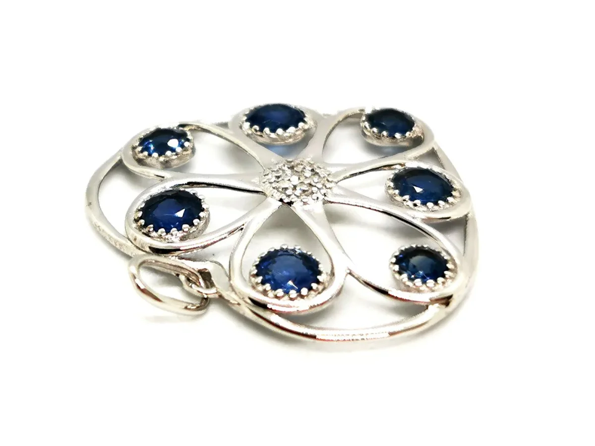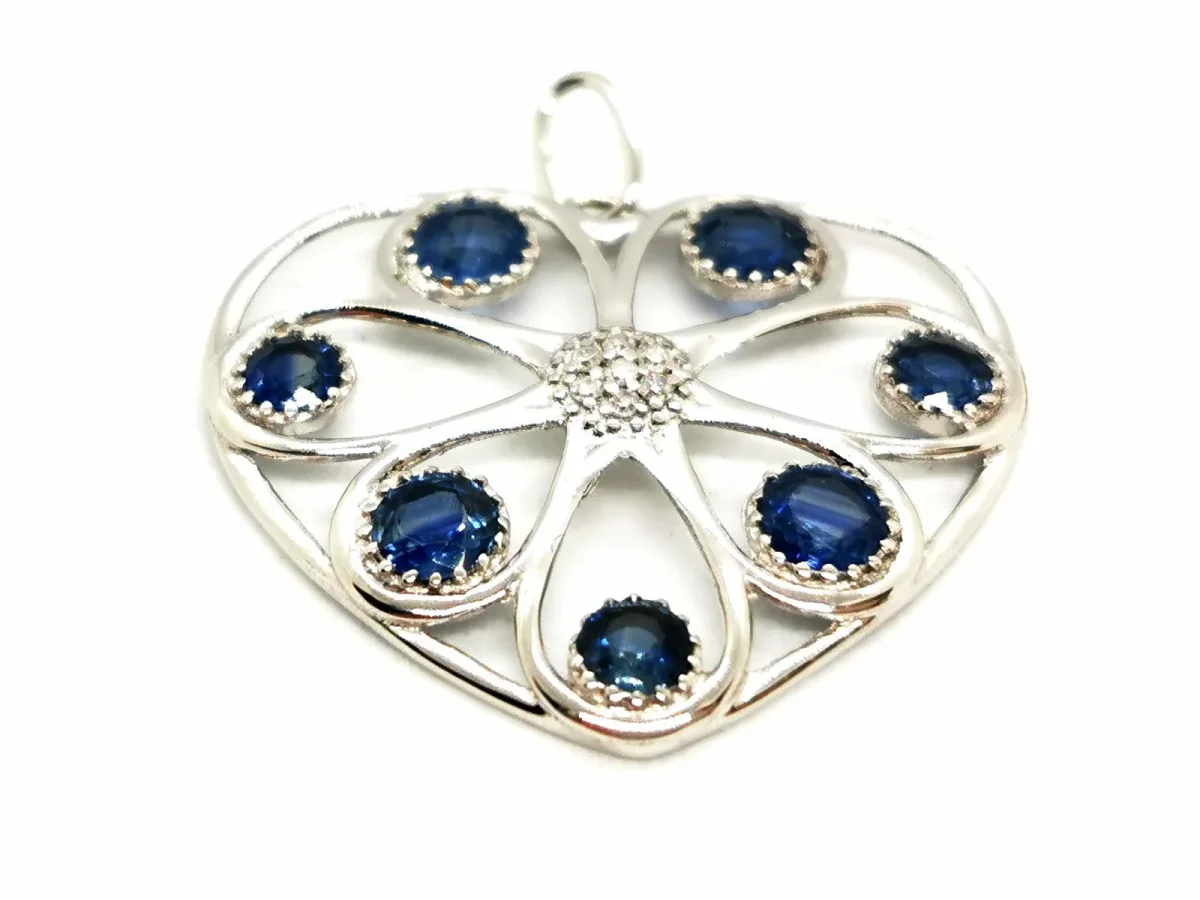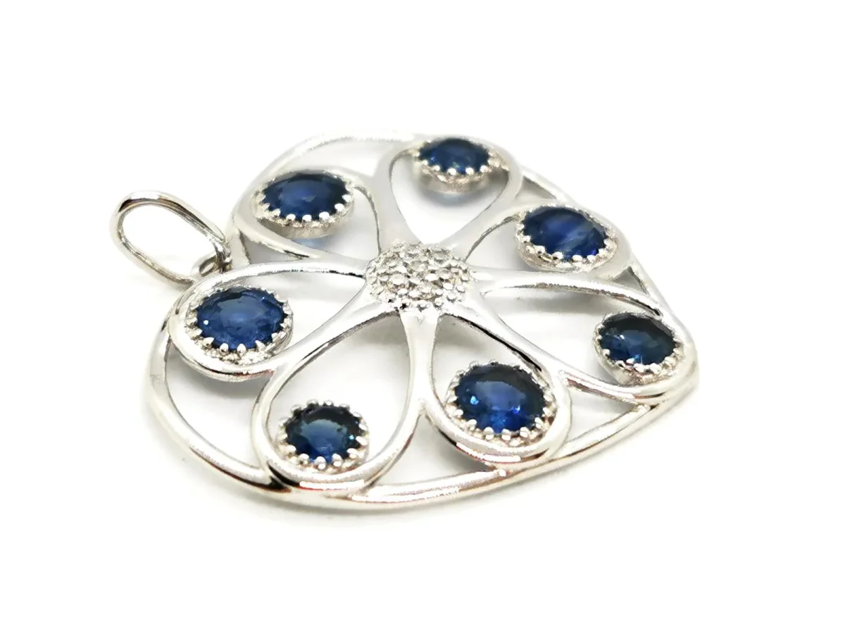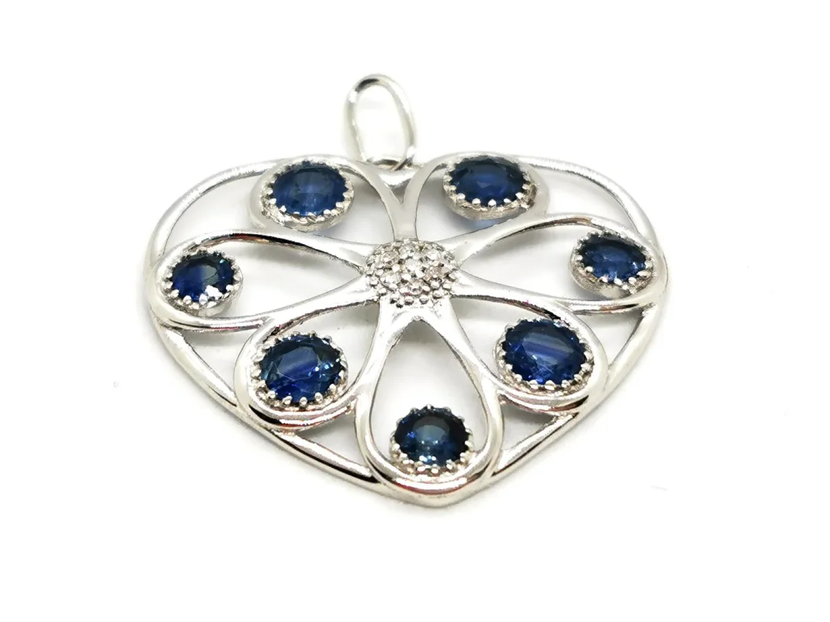 Pendentif cœur saphirs et diamants, en or blanc 750 millièmes (18 carats) testé, serti de 7 saphirs rond d’environ 0,11 ct chacun, poids total saphirs: environ 0,77 ct, et au centre, de 7 diamants, taille brillant environ H/SI, d’environ 0,005 ct chacun, poids total diamants: environ 0,035 ct, dimensions: (bélière incluse): 2,3 cm x 2,11 cm, poids total: 1,34 g, excellent état