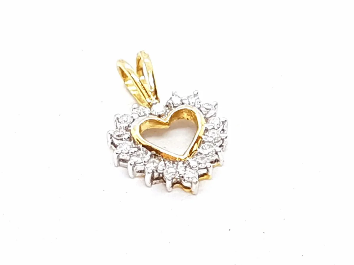 Pendentif coeur en or jaune 750 millièmes (18 carats), et serti sur or blanc de 16 diamants taille brillant H-SI pour environ 0,12 ct au total, dimensions: 1,55 cm x 1 cm (bélière incluse), poids total: 0,92 g, poinçon tête d’aigle sur la bélière, excellent état