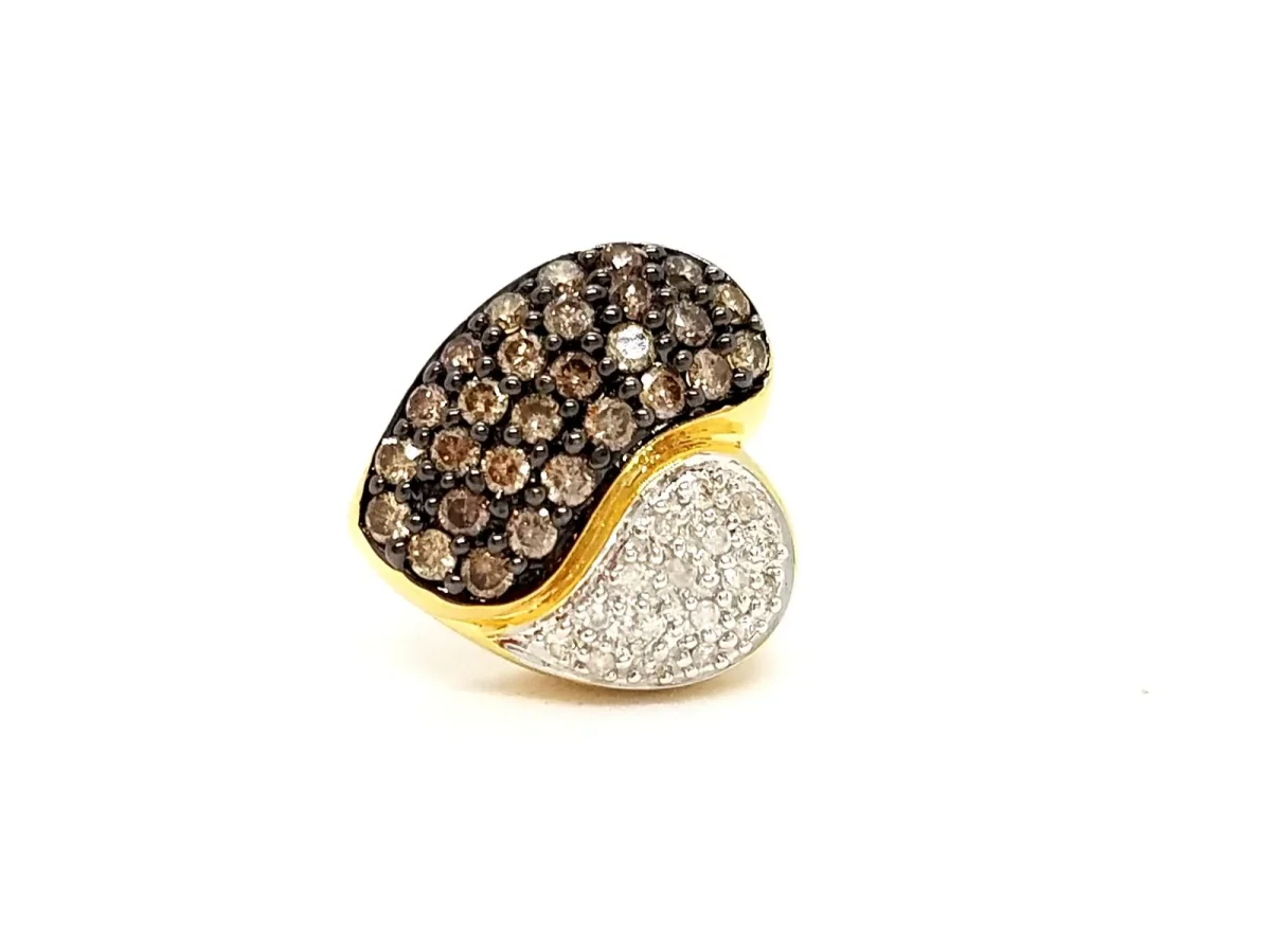 Pendentif coeur, en or 750 millièmes (18 carats) testé, coeur en or jaune, pavé de 28 diamants brun taille brillant sertis sur or noir pour environ 0,42 ct au total, et de 17 diamants blanc taille brillant sertis sur or blanc H-SI pour environ 0,10 ct au total, poids total des diamants: environ 0,52 ct, bélière invisible, dimensions: 1,31 cm x 1,26 cm, poids total: 2,30 g, excellent état