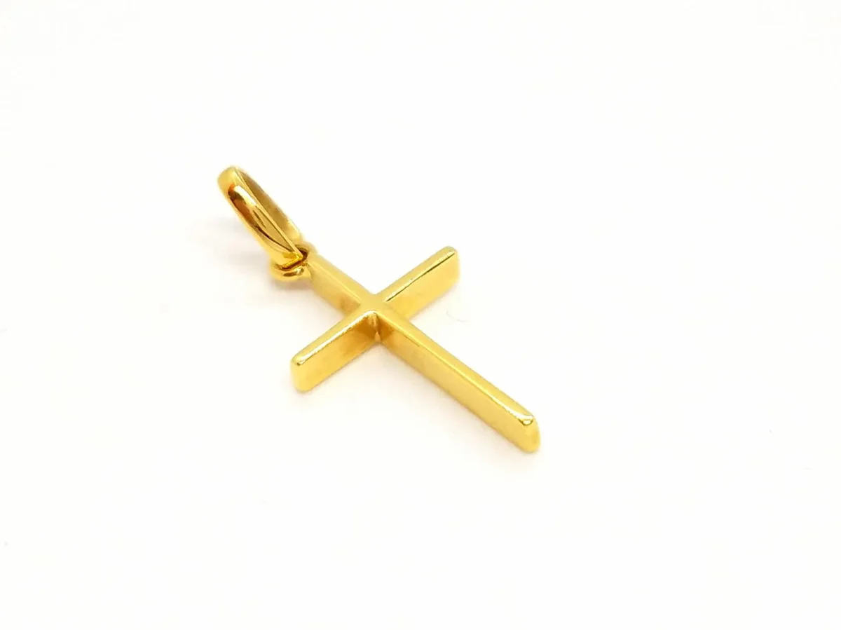 Pendentif croix, en or jaune 750 millièmes (18 carats), fil section carré, dimensions: 2,46 cm x 1,11 cm (bélière incluse), poids total: 1,03 g, poinçon tête d’aigle, état neuf