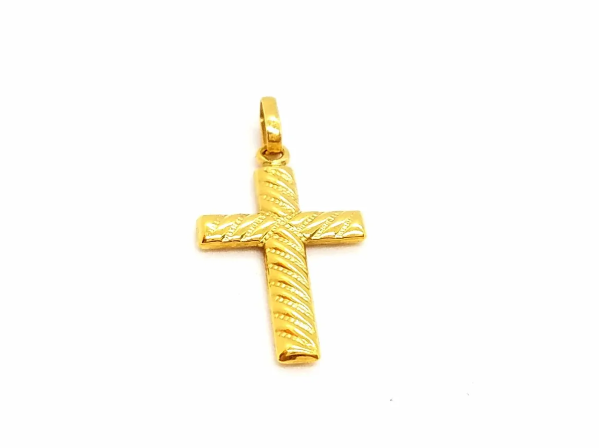 Pendentif croix, en or jaune 750 millièmes (18 carats), dimensions: 2,67 cm x 1,31 cm (bélière incluse), poids total: 0,78 g, poinçon tête d’aigle, état neuf