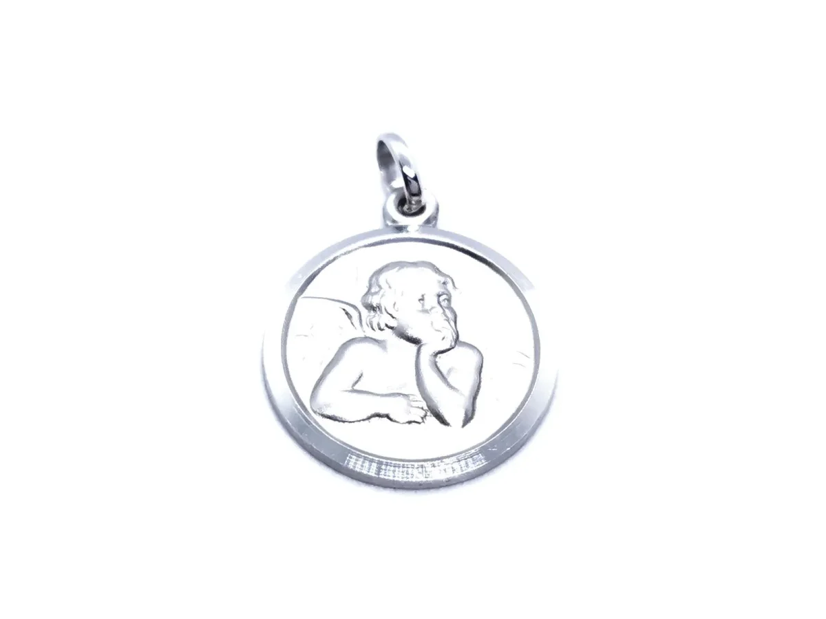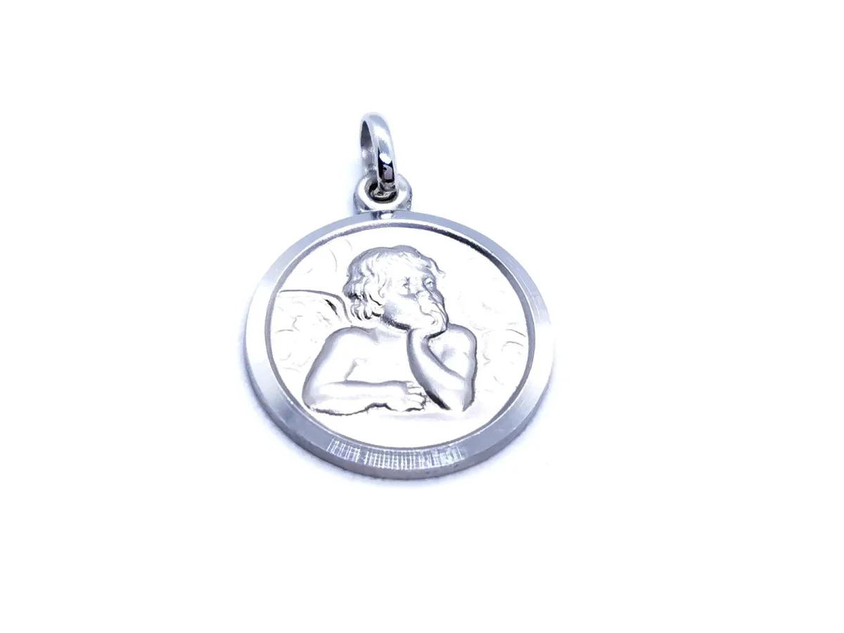 Pendentif en or blanc 750 millièmes (18 carats), médaille ronde ange, dimensions: 2,01 cm x 1,71 cm, poids total: 3,56 g, poinçon tête d’aigle, état neuf