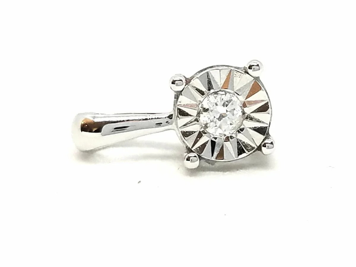 Pendentif en or blanc 750 millièmes (18 carats) testé, serti d’un diamant taille brillant G-H V-SI d’environ 0,030 ct, dimensions pendentif:1,07 cm x 0,51 cm (bélière incluse), Poids total: 0,56 g, état neuf