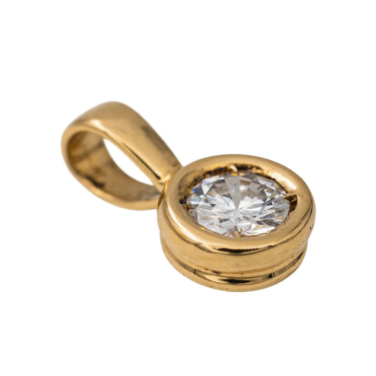 Pendentif en or jaune 750 millièmes (18 carats), serti d’un diamant taille brillant, estimé H/VS, d’un poids d’environ 0,24 ct, dimensions avec la bélière: 1,12 cm x 0,62 cm, poids total: 0,85 g, poinçon tête d’aigle, excellent état