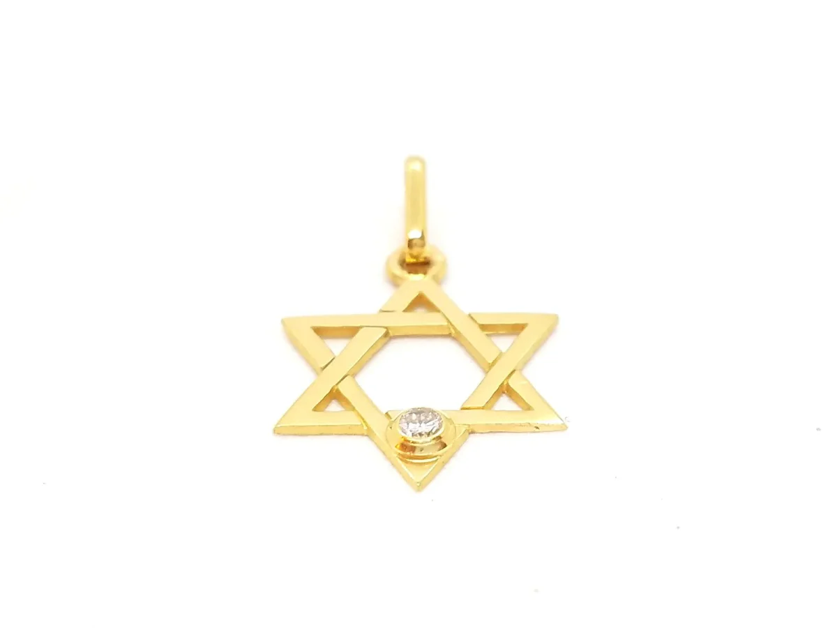 Pendentif en or jaune 750 millièmes (18 carats) testé, motif étoile de David, serti d’un diamant taille brillant G-H V-SI d’environ 0,025 ct, dimensions du pendentif: 1,88 cm x 1,47 cm, Poids total: 0,91 g, état neuf