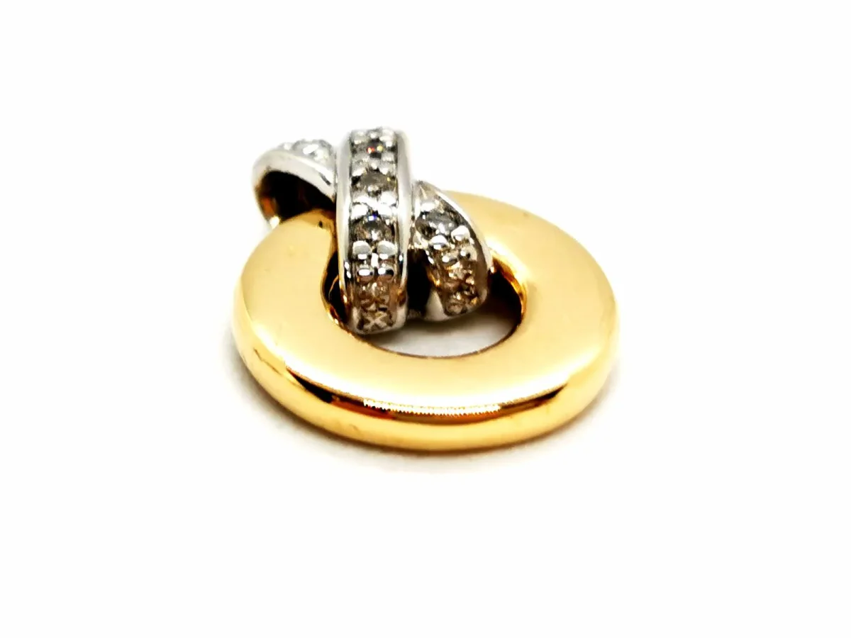 Pendentif bicolore, en or jaune et or blanc 750 millièmes (18 carats), composé d’un cercle lisse en or jaune, surmonté d’un double lien entrelaçé et mobile en or blanc, serti de 6 diamants, taille brillant pour environ 0,03 ct au total, environ H/SI, dimensions: 1,49cm X 1,19cm, poids total: 2,01 g, poinçonné tête d’aigle, excellent état.