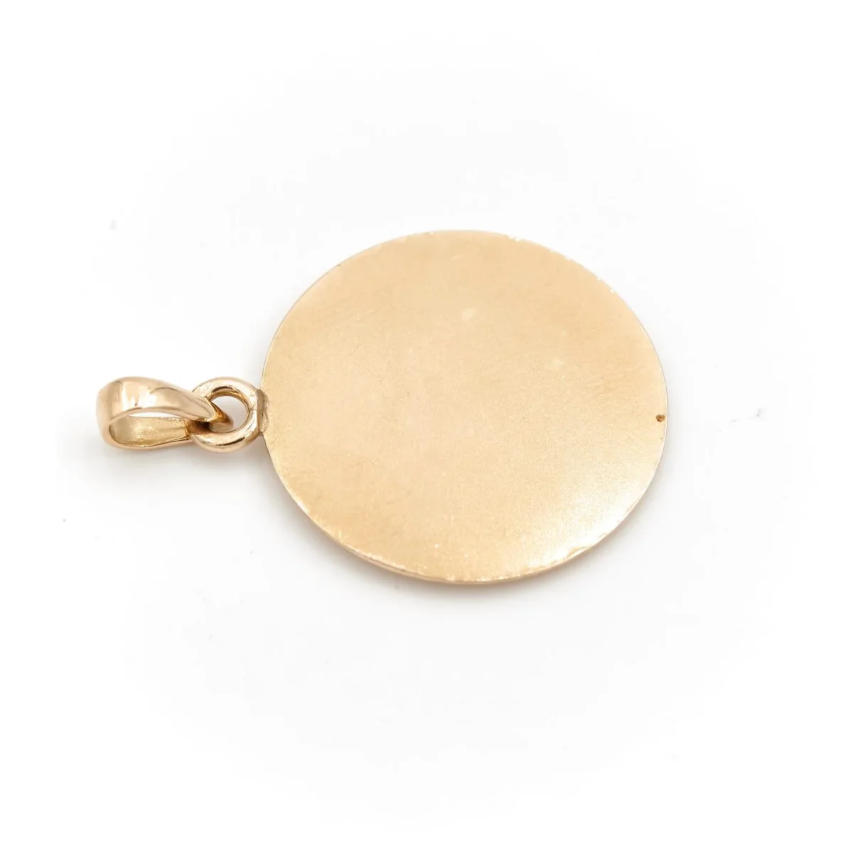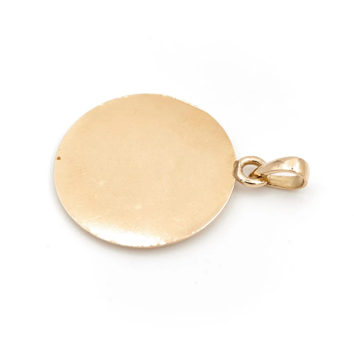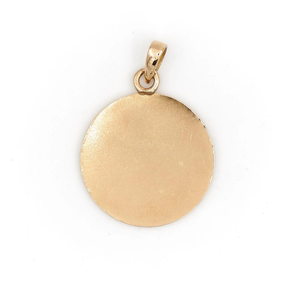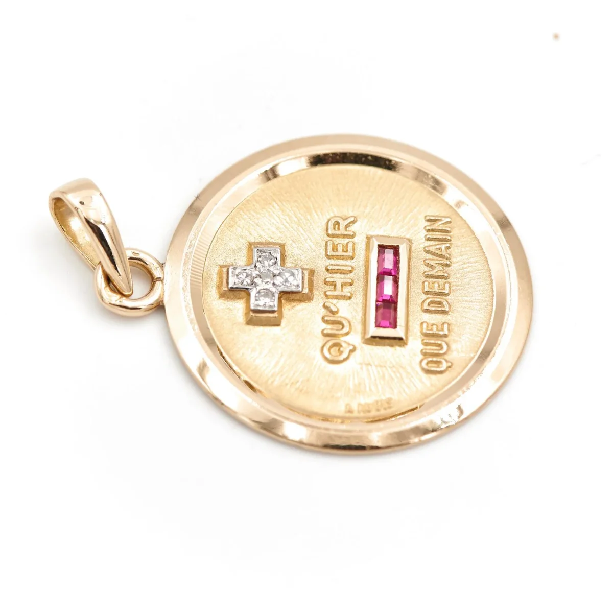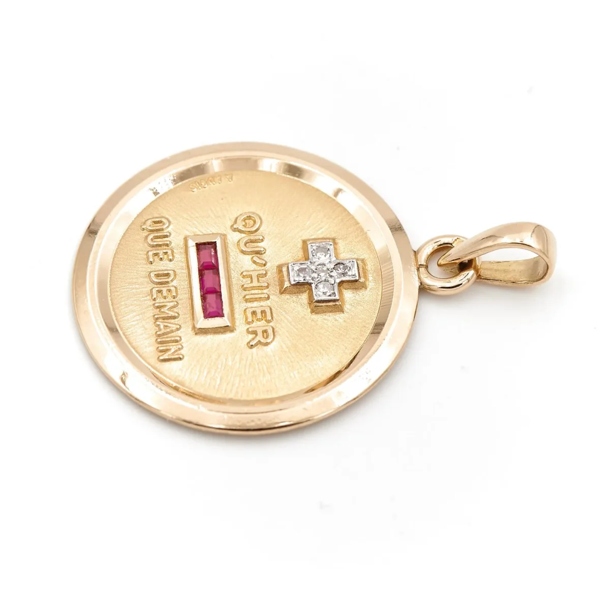 Médaille signée Augis en or jaune et or blanc 750 millièmes (18 carats), Modèle + qu’hier – que demain, sertie de 5 diamants taille brillant d’environ 0,01 ct chacun, Diamants estimés G/VS, 3 rubis taille baguette d’environ 0,01 ct chacun, Poids total des diamants: 0,05 ct, Poids total des rubis: 0,03 ct, Longueur: 3,33 cm, Largeur: 2,36 cm, Poids total: 5,69 g, Poinçon tête d’aigle, Excellent état