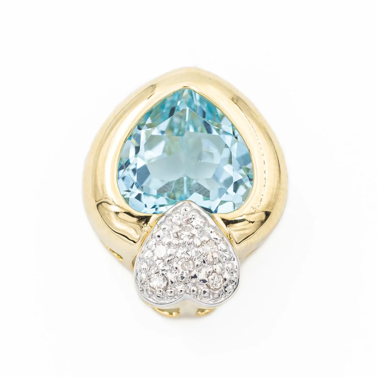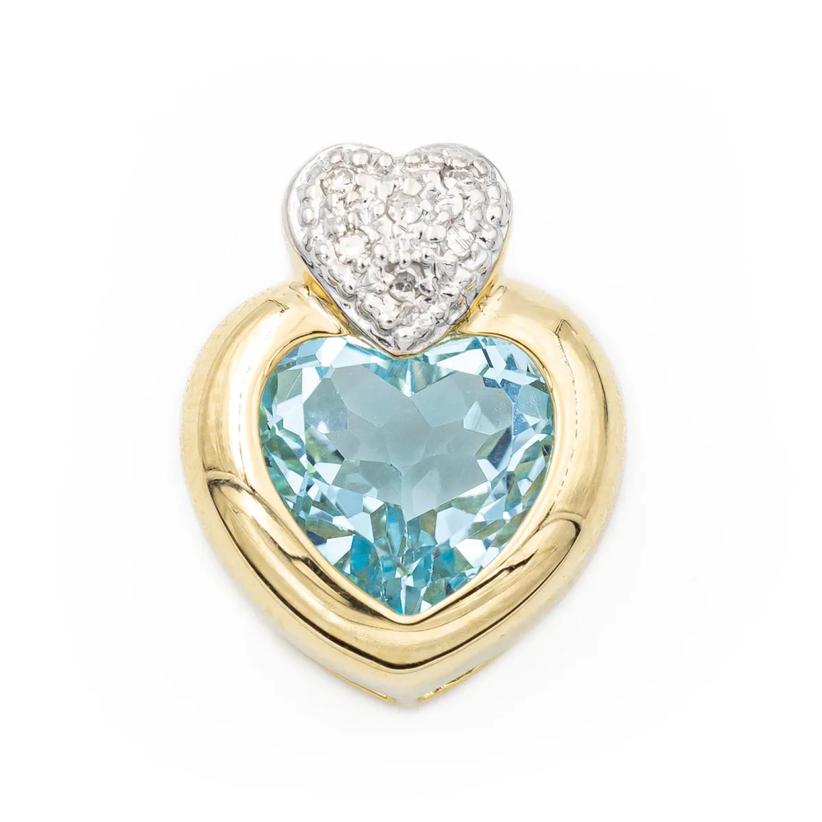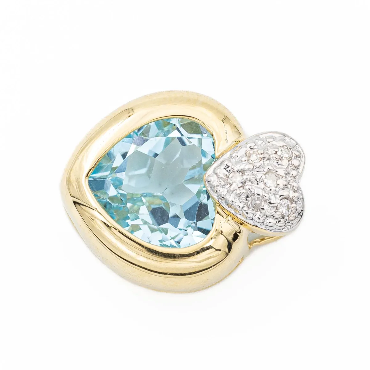 Pendentif cœur en or jaune et or blanc 750 millièmes (18 carats), sertie d’une topaze bleue traitée taille cœur environ 2,85 cts et de 6 diamants taille brillant, estimés G/VS environ 0,01 ct chacun, Poids total des diamants: 0,06 ct, dimensions (bélière incluse): 1,70 cm X 1,40 cm, poids total: 3,02 g, Poinçon tête d’aigle, excellent état.
