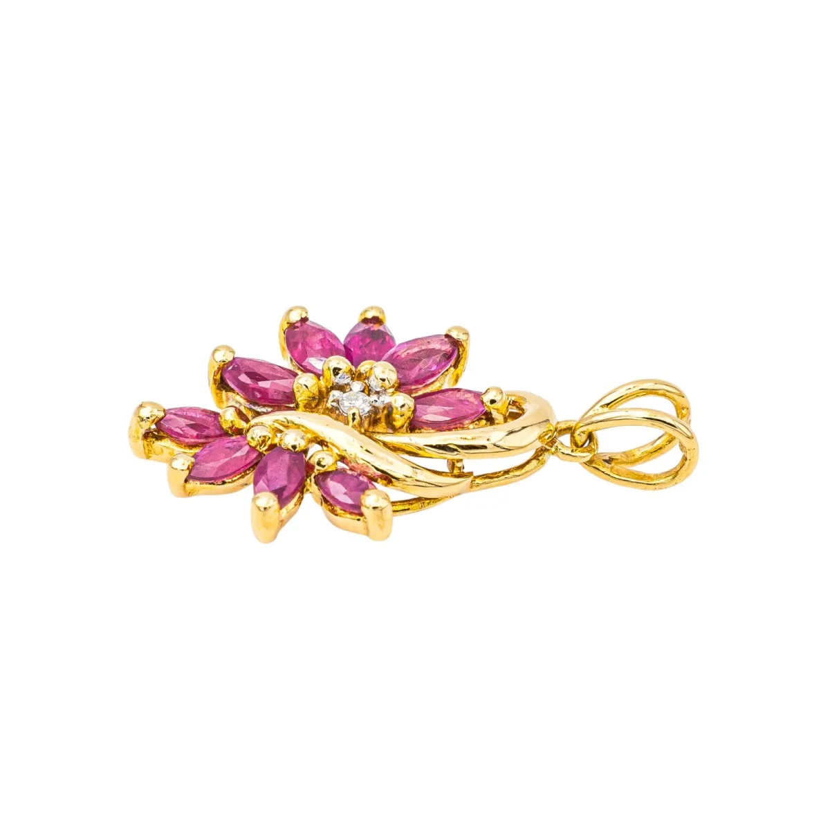 Pendentif en or jaune 750 millièmes (18 carats) testé, serti de rubis et de diamants, 9 rubis taille marquise, d’un poids total d’environ 0,90 ct, (chaque rubis d’un poids d’environ 0,10 ct), entourés de 2 diamants taille brillant, environ H-SI, d’un poids total d’environ 0,01 ct, (chaque diamant d’un poids d’environ 0,005 ct), dimensions avec la bélière : 2,50 cm x 1,35 cm, poids total : 2,40 g, excellent état