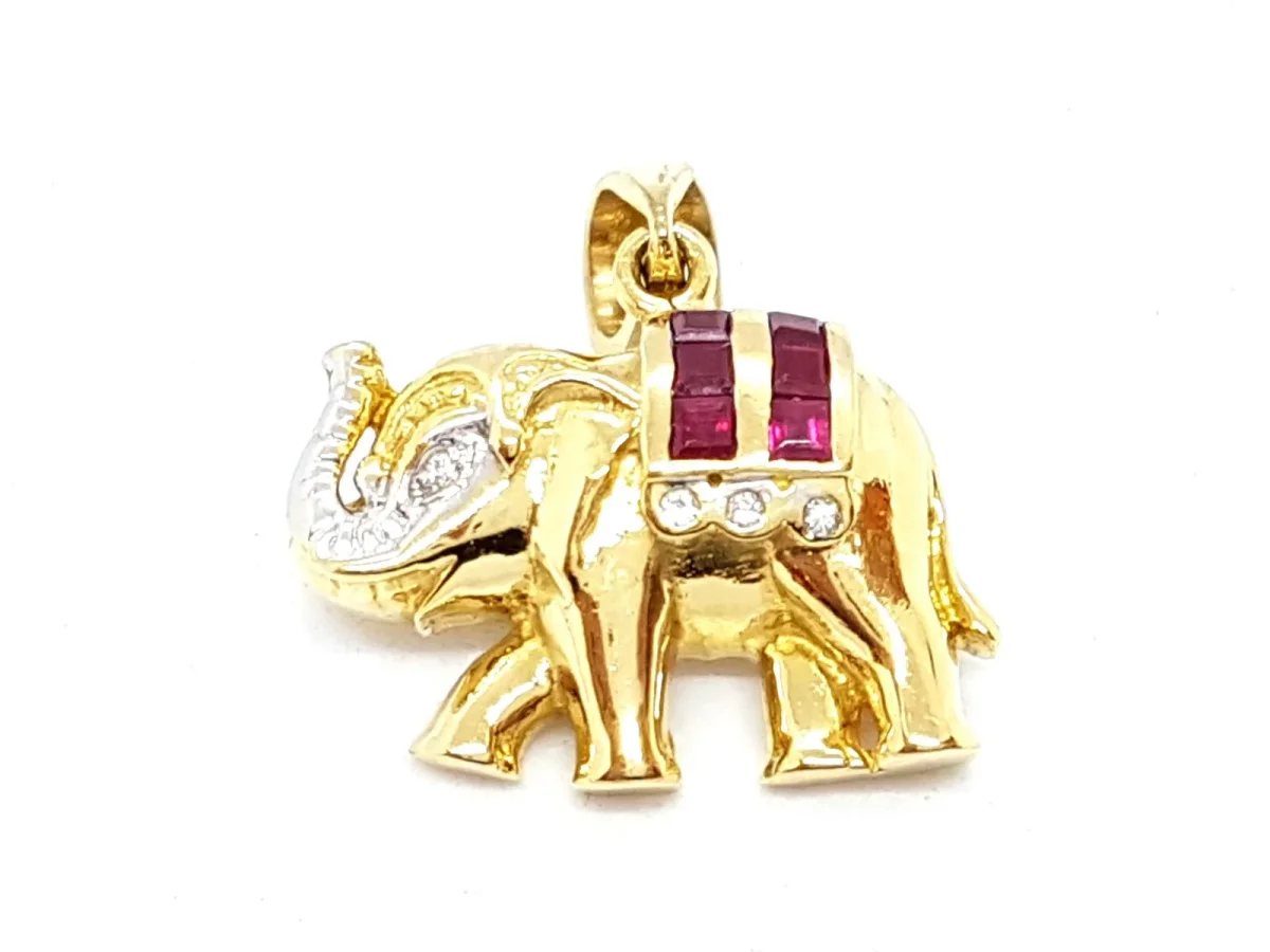 Pendentif vintage, éléphant en Or jaune 750 millièmes (18 carats), avec 6 rubis carrés pour environ 0,06 ct au total, 3 diamants taille brillant G-H VSI pour environ 0,015 ct au total, Poids total: 6.20 g, dimensions: 2 cm x 1.5 cm, Poinçonné, Excellent état