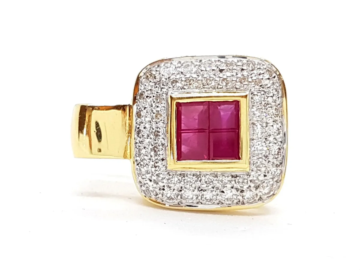 Joli pendentif en or jaune 750 millièmes (18 carats), serti de 4 rubis carrés pour environ 0,20 ct au total, et pavé de diamants taille brillant H-SI pour environ 0,24 total, dimensions: 1,43 cm x 2 cm (bélière incluse), poids total: 4,16 g, poinçon tête d’aigle, excellent état