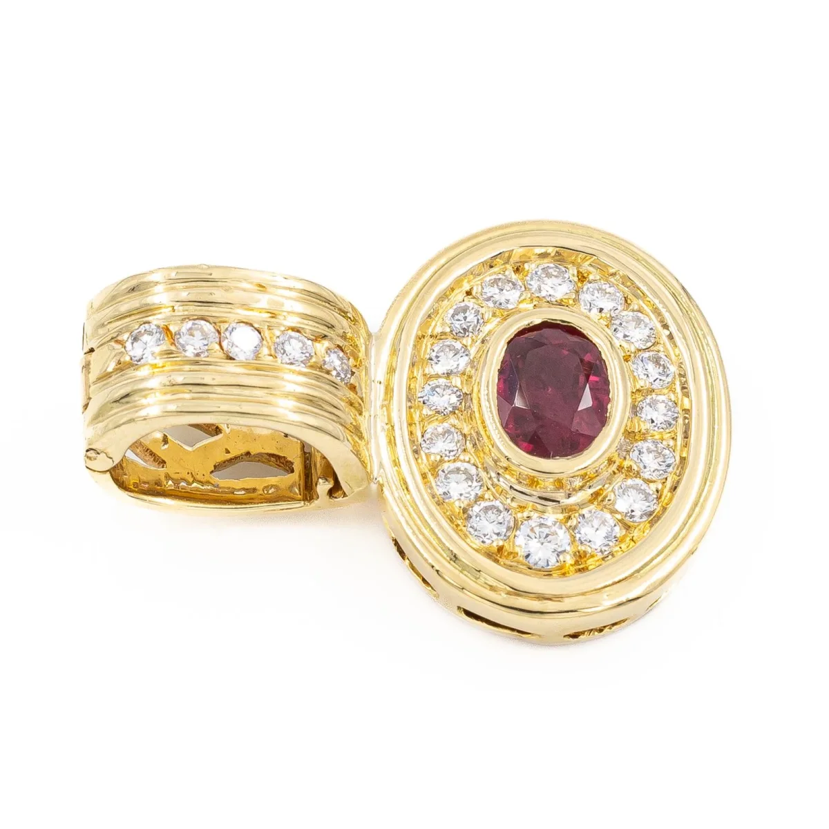 Pendentif en or jaune 750 millièmes (18 carats), serti de 21 diamants de taille brillant, estimés G/VS, environ 0,01 ct chacun, et d’un rubis de taille ovale d’environ 0,57 ct, Poids total des diamants: 0,21 ct, dimensions avec la bélière: 2,48 cm x 1,76 cm, poid total: 6,24 g, poinçon hibou, excellent état