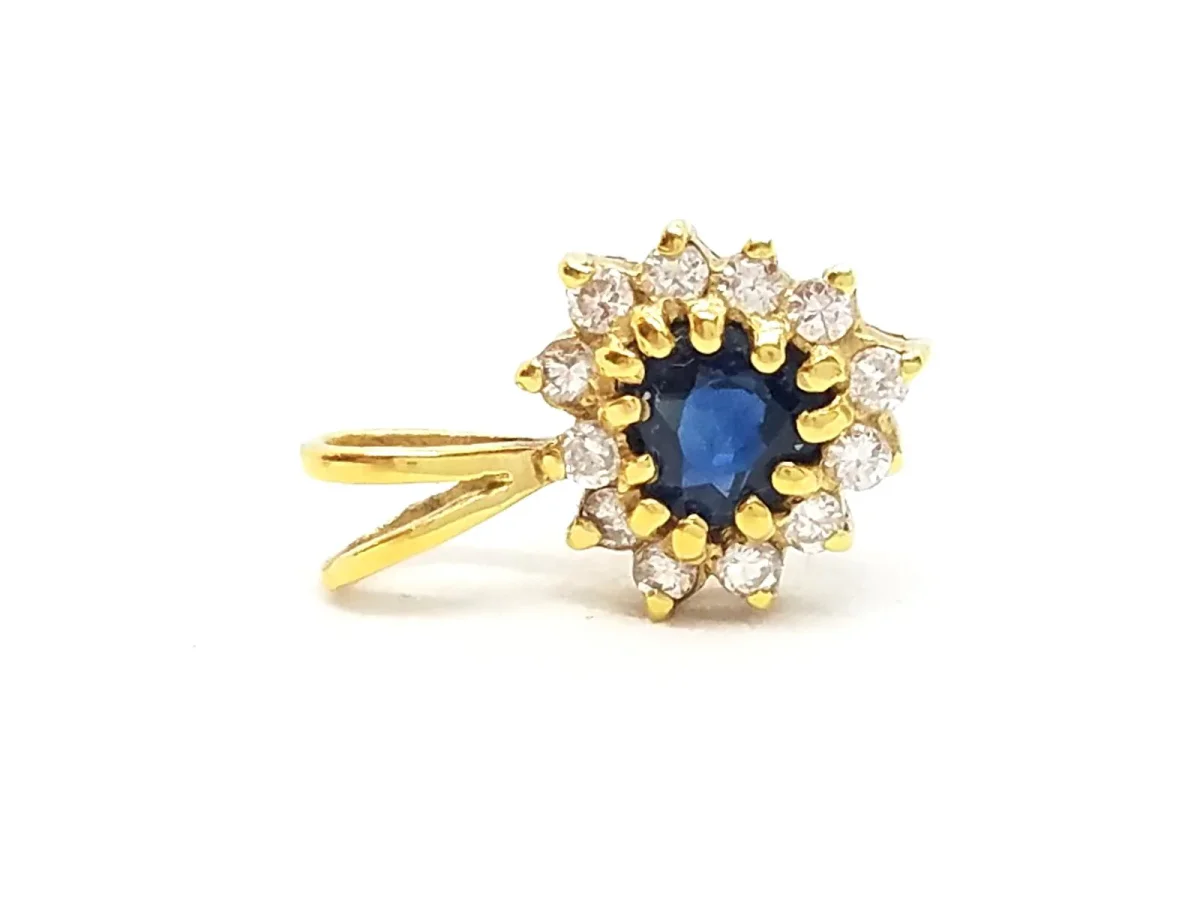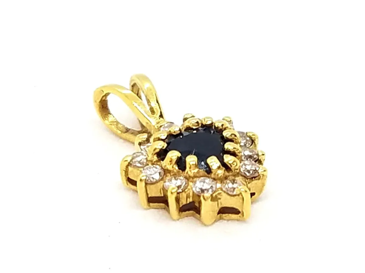 Pendentif coeur en or jaune 750 millièmes (18 carats), serti d’un saphir taillé en coeur d’environ 0,15 ct (dimensions: 3,5 mm x 3,6 mm), et de 12 diamants taille brillant G-H V-SI pour environ 0,09 ct, dimensions pendentif: 1,23 cm x 0,76 cm, (bélière incluse), Poids total: 0,67 g, poinçon tête d’aigle, état neuf