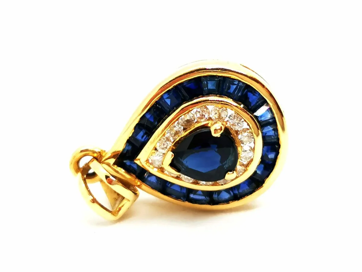 Pendentif saphirs et diamants, en or jaune 750 millièmes (18 carats) testé, serti d’un saphir poire d’environ 0,40 ct, de 18 saphirs carrés d’environ 0,01 ct chacun, poids total saphirs: environ 0,58 ct, et de 14 diamants, taille brillant environ G/VS, d’environ 0,008 ct chacun, poids total diamants: environ 0,11 ct dimensions (bélière incluse): 2 cm x 1,1 cm, poids total: 1,82 g, excellent état