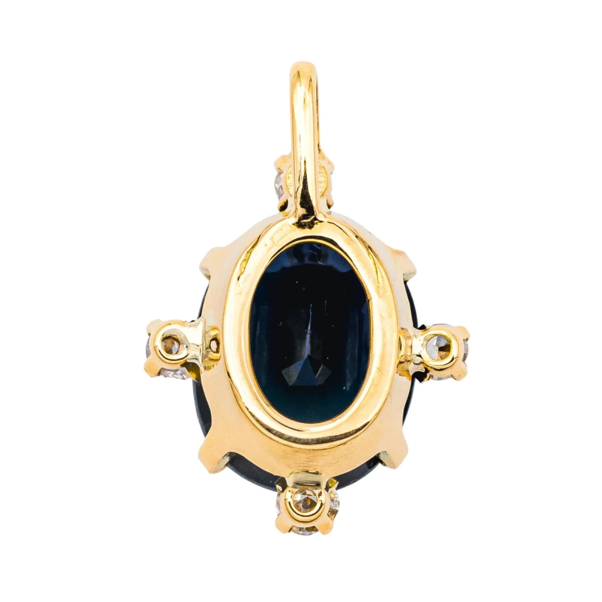 Pendentif en or jaune 750 millièmes (18 carats) testé, serti d’un saphir et de diamants, 1 saphir taille ovale, d’un poids total d’environ 1,15 cts, entouré de 4 diamants taille brillant, environ H-SI, d’un poids total d’environ 0,04 ct (chaque diamant d’un poids d’environ 0,01 ct), dimensions avec la bélière : 1,69 cm x 1,62 cm, poids total : 2,07 g, excellent état