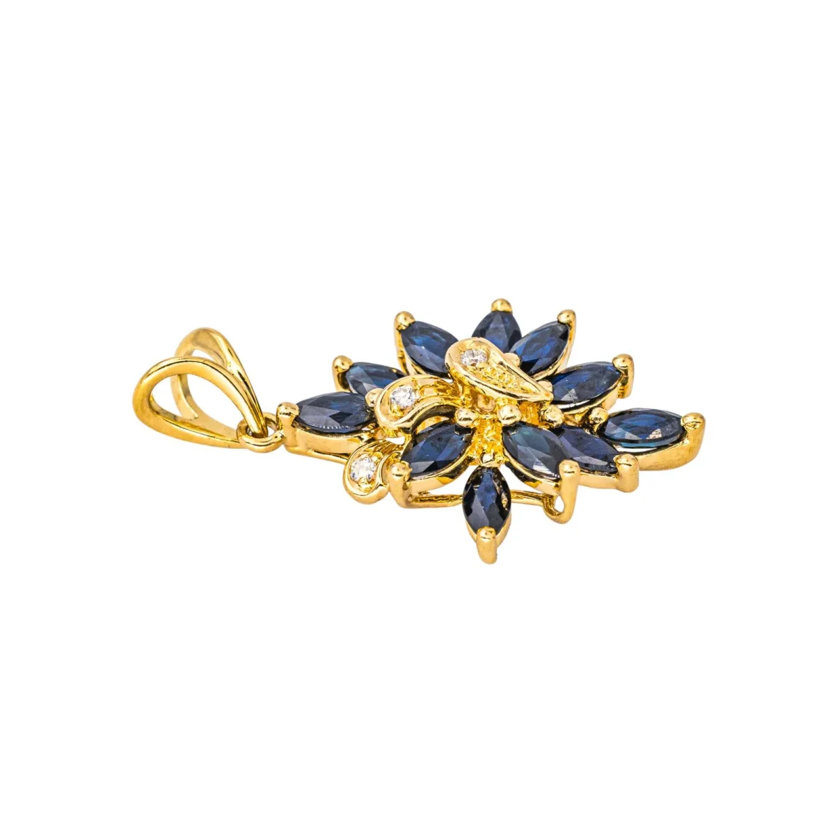 Pendentif en or jaune 750 millièmes (18 carats), serti de saphir et de diamants, 11 saphirs taille navette, d’un poids total d’environ 1,43 ct, (chaque saphir d’un poids d’environ 0,13 ct), 3 diamants taille brillant, environ H-VS, d’un poids total d’environ 0,03 ct, (chaque diamant d’un poids d’environ 0,01 ct), dimensions avec la bélière : 2,91 cm x 1,64 cm, poids total : 3,20 g, poinçon tête d’aigle, excellent état