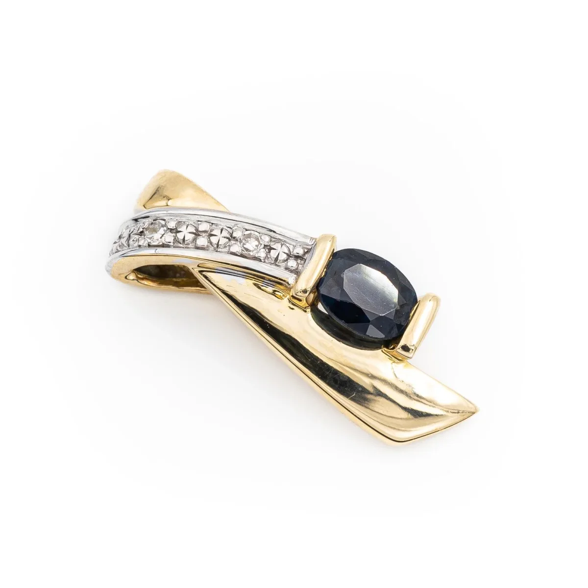 Pendentif en or jaune 750 millièmes (18 carats) testé, Serti d’un saphir oval environ 0,30 ct, et de 2 diamants taille brillant, estimés G/VS environ 0,01 ct chacun Poids total des diamants: 0,02 ct, Dimensions: 1,72 x 0,85 cm, Poids total: 1,15 g, Excellent état