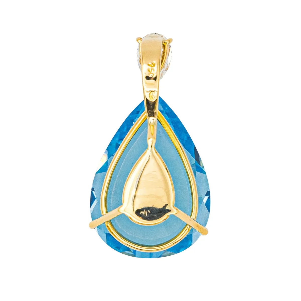 Pendentif en or jaune 750 millièmes (18 carats), serti d’une topaze et d’un diamant, une topaze taille poire, d’un poids total d’environ 20,70 cts, entourée d’un diamants taille poire, environ G/VS, d’un poids total d’environ 0,90 ct, dimensions avec la bélière : 2,90 x 1,50 cm, poids total : 5,77 g, poinçon tête d’aigle, excellent état