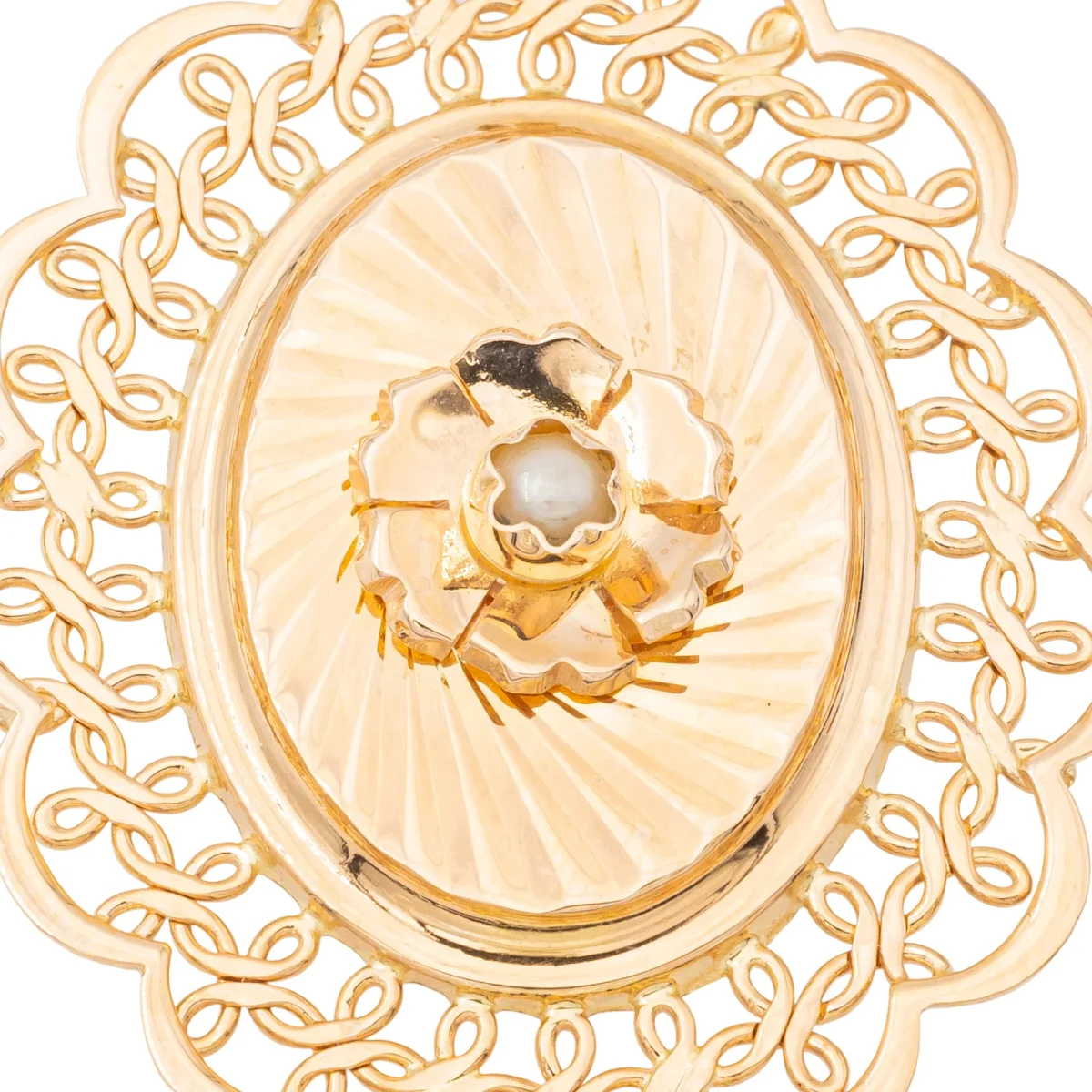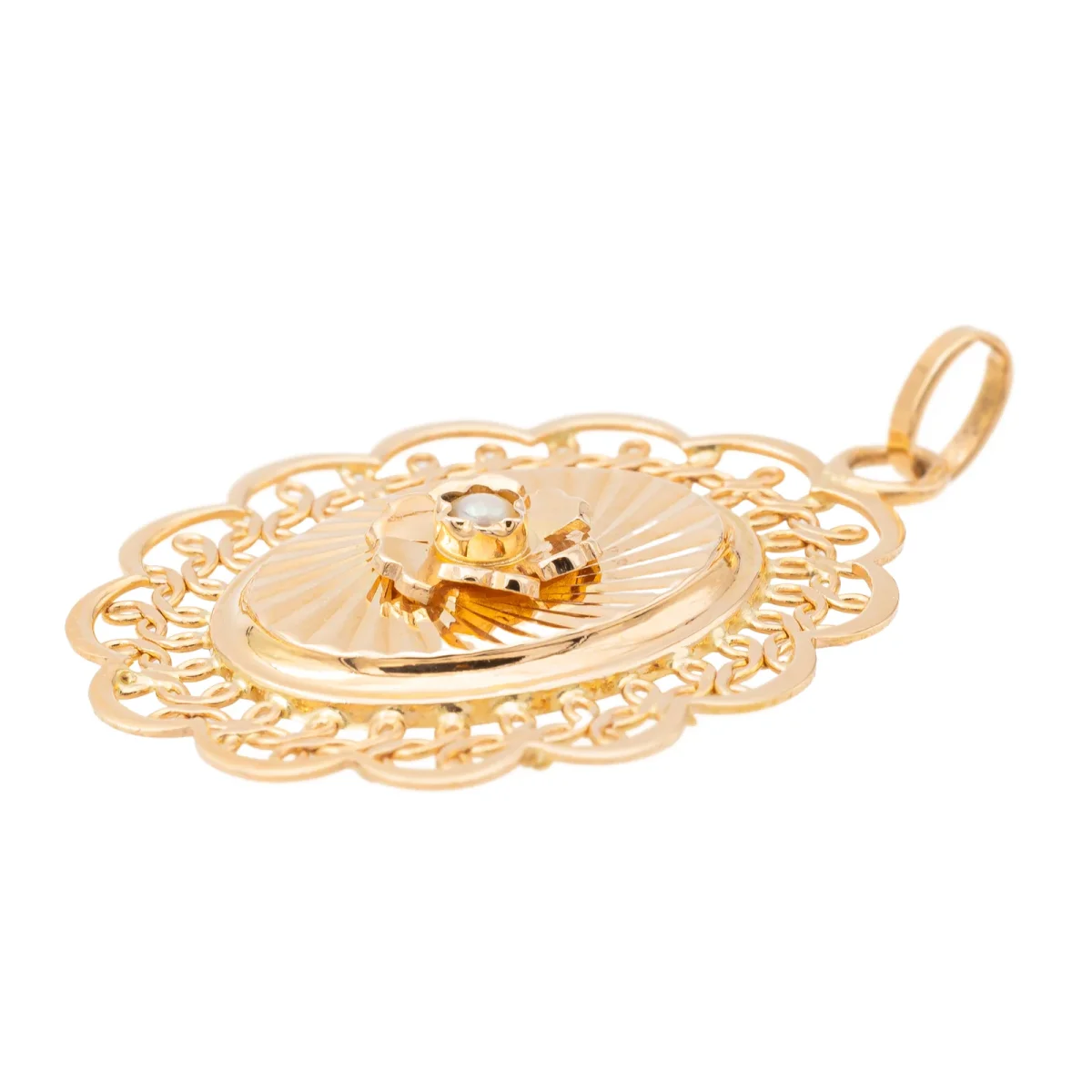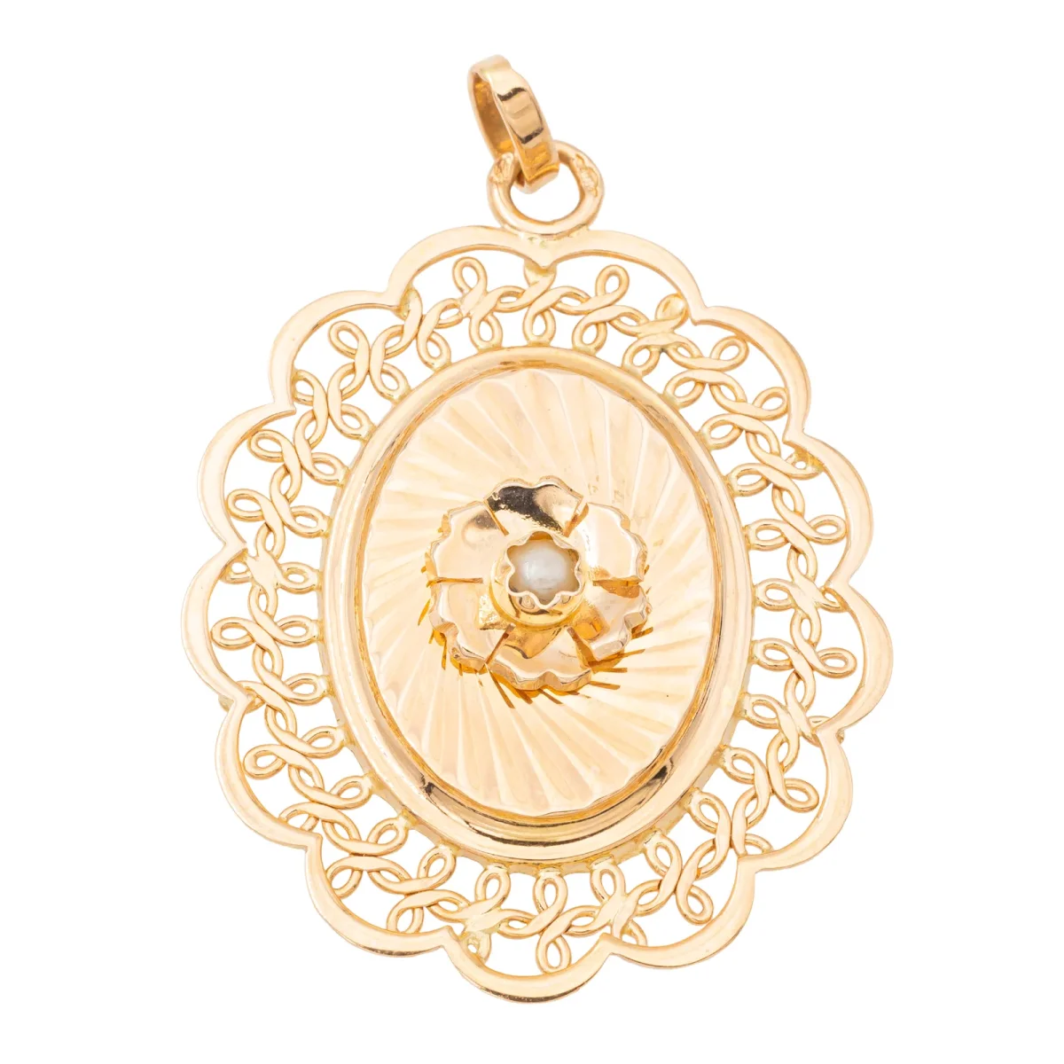 Pendentif en or rose 750 millièmes (18 carats), medaillon avec perle de culture, longueur : 2,55 cm, largeur : 3,67 cm, épaisseur : 0,42 cm, perle de culture : 0,22cm, poids total : 3,03 g, poinçon tête d’aigle, excellent état.