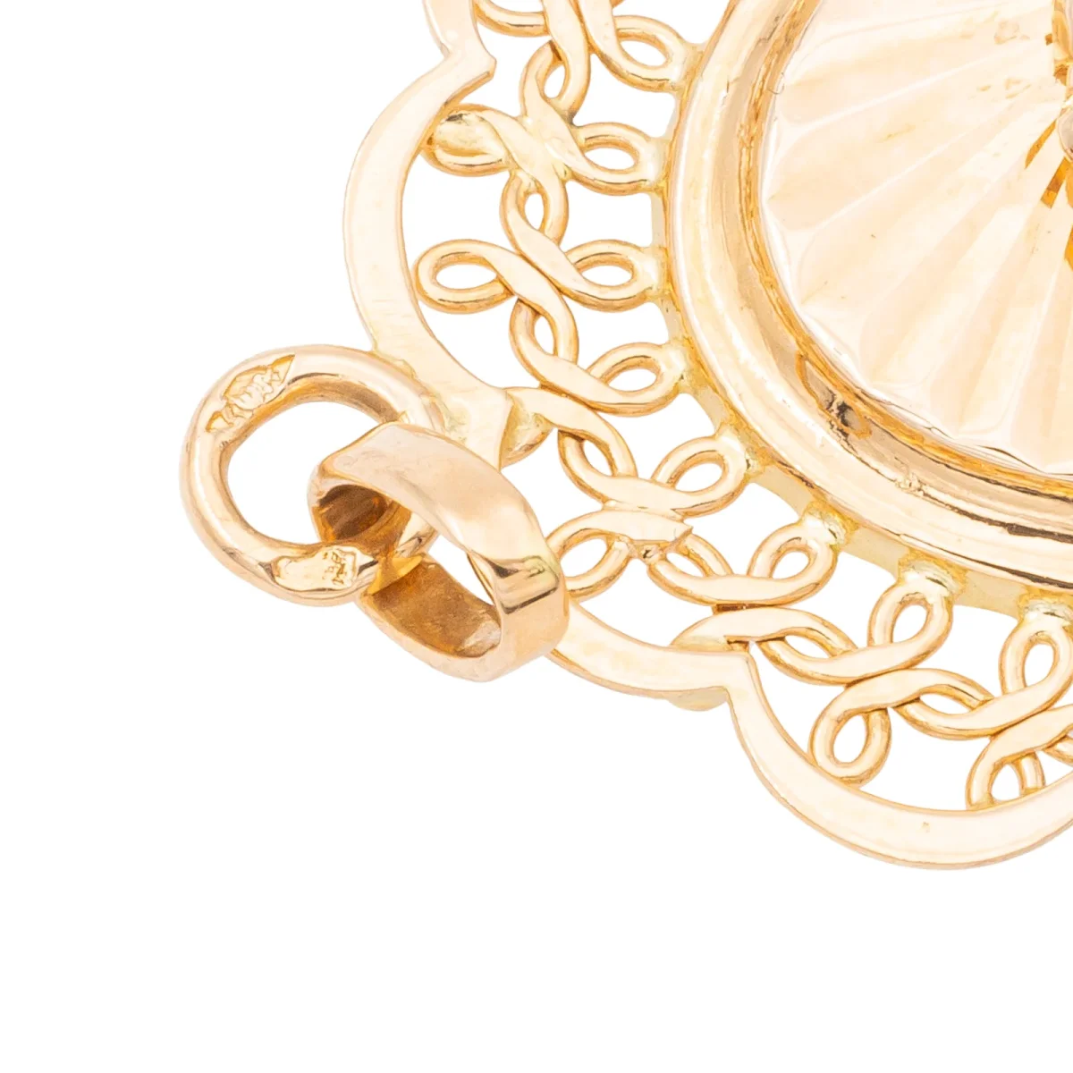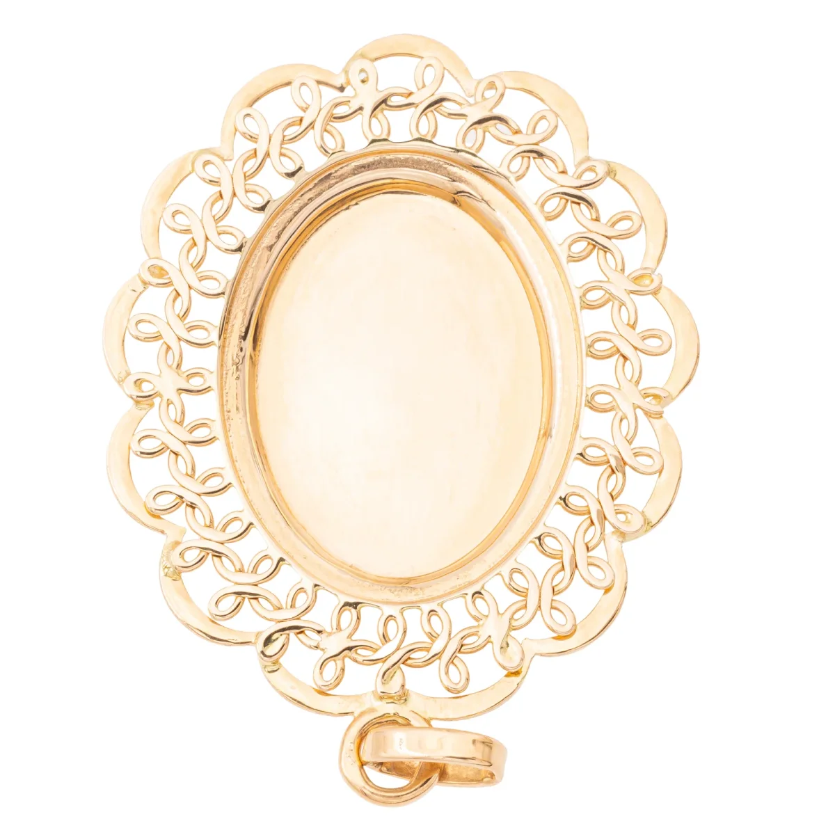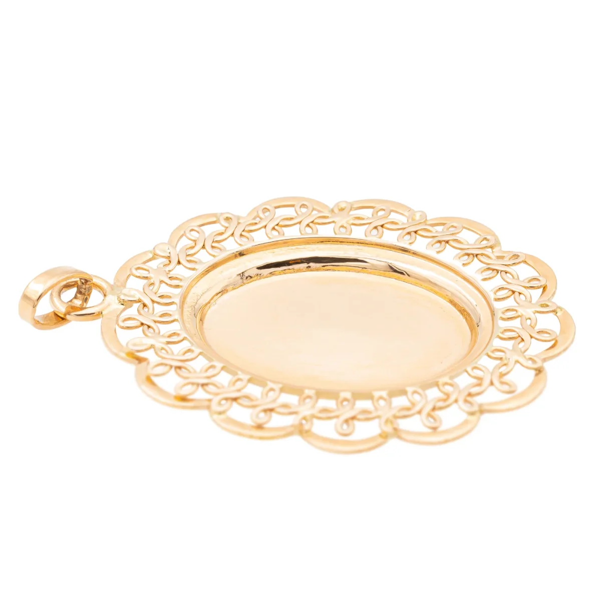 Pendentif en or rose 750 millièmes (18 carats), medaillon avec perle de culture, longueur : 2,55 cm, largeur : 3,67 cm, épaisseur : 0,42 cm, perle de culture : 0,22cm, poids total : 3,03 g, poinçon tête d’aigle, excellent état.