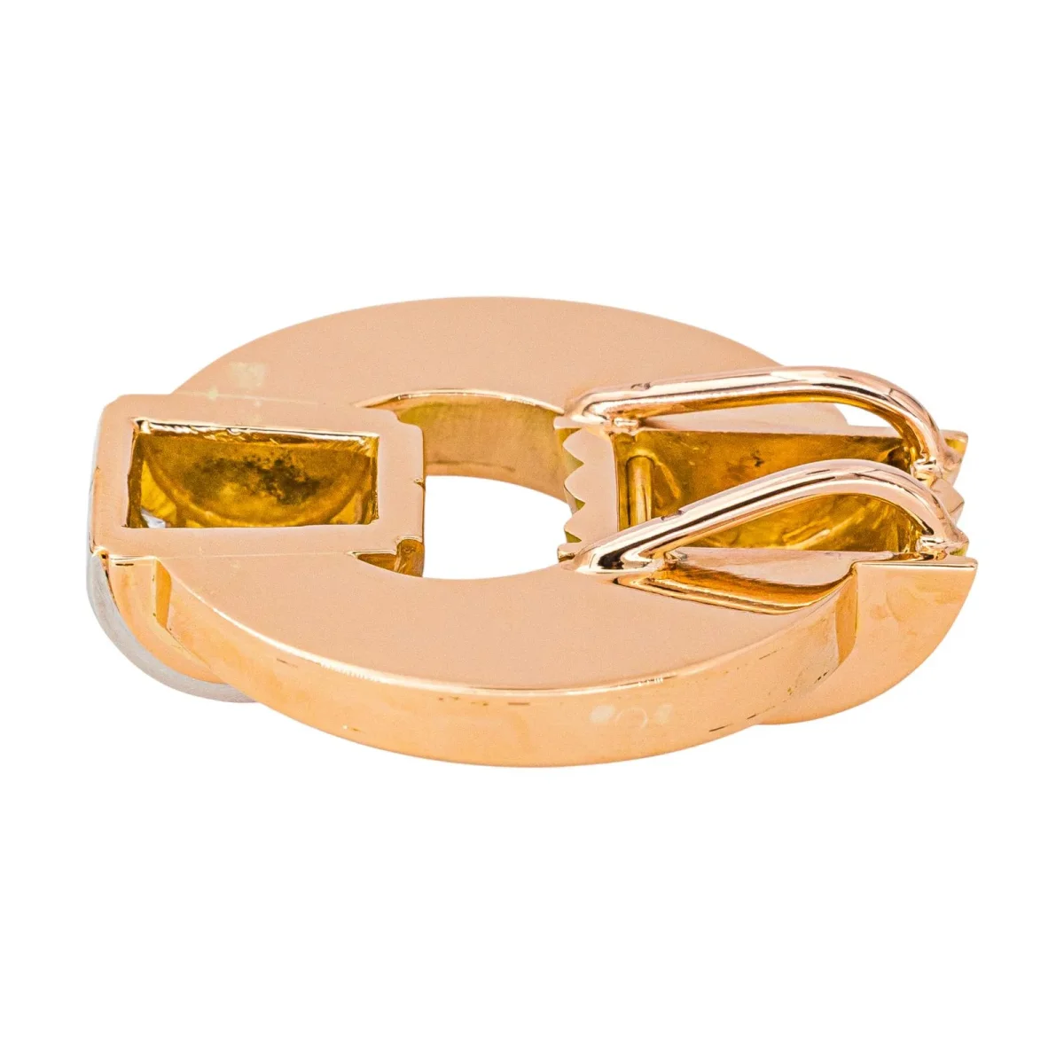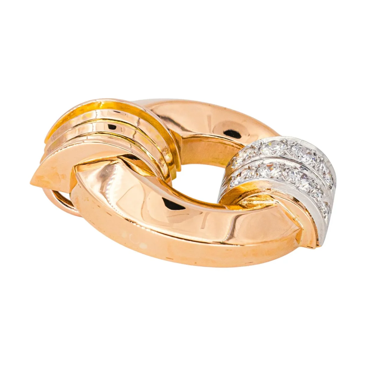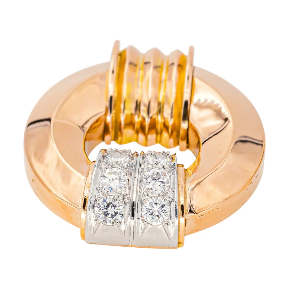 Pendentif rétro, en or rose 750 millièmes (18 carats) et platine 950 millièmes, serti de 8 diamants taille brillant, environ G-VS, poids total des diamants : environ 0,88 ct, (chaque diamant d’un poids d’environ 0,11 ct), dimensions : 3,15 cm x 2,65 cm, épaisseur : 1,01 cm, poids total: 19,16 g, poinçon tête d’aigle, excellent […]