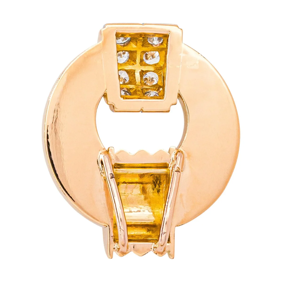 Pendentif rétro, en or rose 750 millièmes (18 carats) et platine 950 millièmes, serti de 8 diamants taille brillant, environ G-VS, poids total des diamants : environ 0,88 ct, (chaque diamant d’un poids d’environ 0,11 ct), dimensions : 3,15 cm x 2,65 cm, épaisseur : 1,01 cm, poids total: 19,16 g, poinçon tête d’aigle, excellent état
