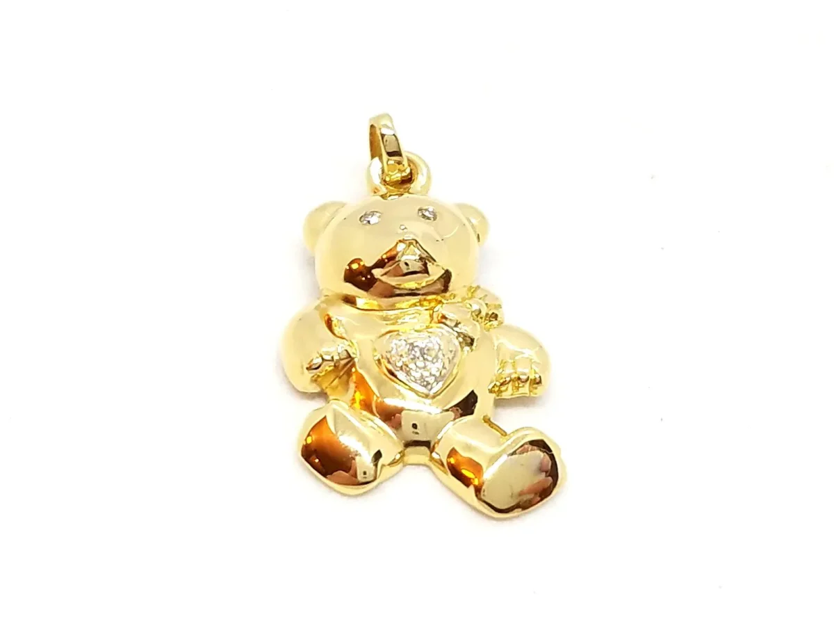 Pendentif ours en or jaune 750 millièmes (18 carats), coeur en or blanc, serti de 3 diamants taille diamant H-SI pour environ 0,01 au total, dimensions pendentif: 2,48 cm x 1,24 cm (bélière incluse), poinçon tête d’aigle, poids total: 2,64 g, excellent état