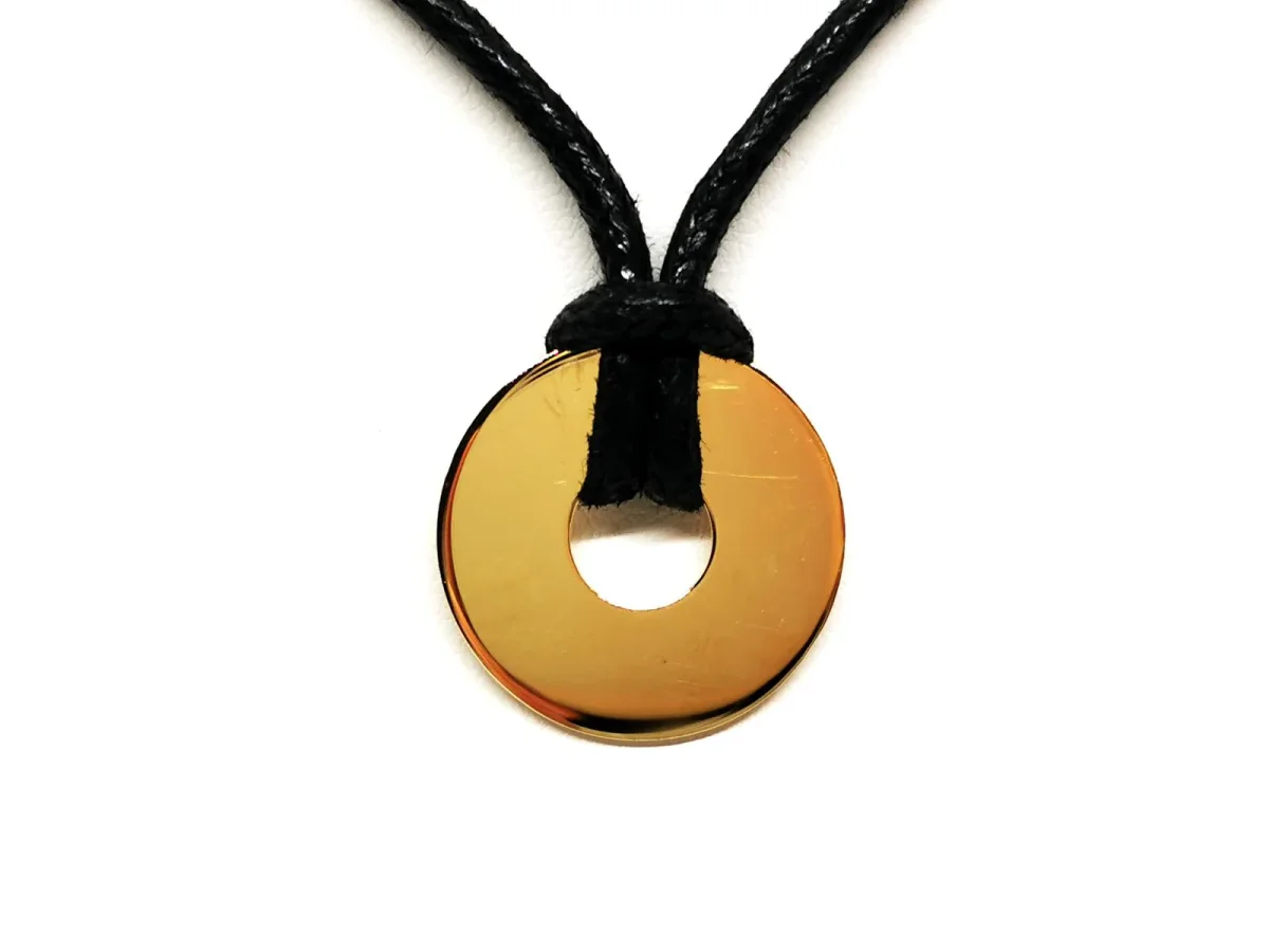 Collier pendentif Pi en or jaune 750 millièmes (18 carats) testé, dimensions: 1,98 cm X 0,64 cm, cordon noir fourni, peut se porter en collier pendentif et en bracelet, poids pendentif: 1,42 g, excellent état.