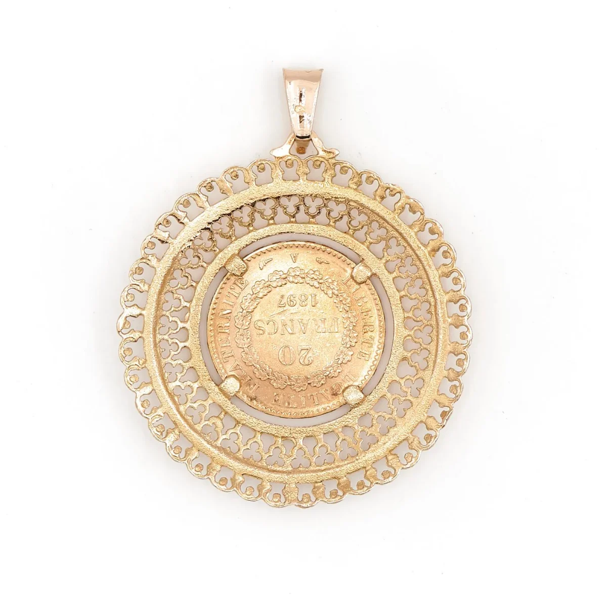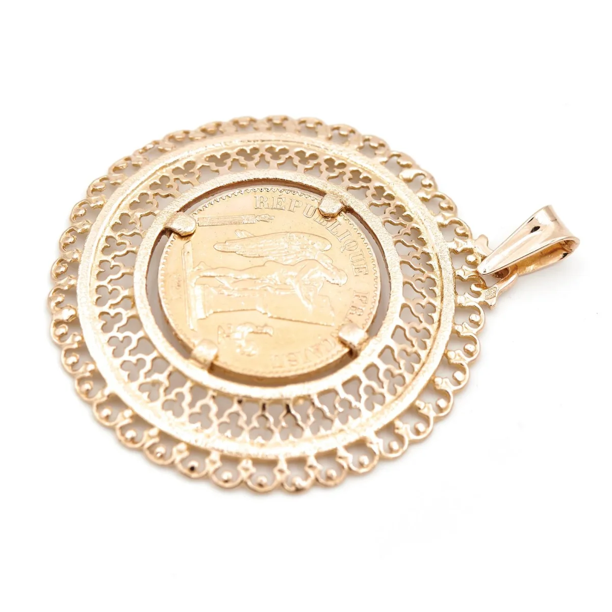 Pendentif en or 750 millièmes (18 carats), avec un pièce de 20 francs en or jaune 900 millièmes (21,6 carats), Poids de la pièce: 6,45 g, Longueur: 5,15 cm, Largeur: 4,15 cm, Poids total: 14,74 g, Poinçon tête d’aigle, Excellent état