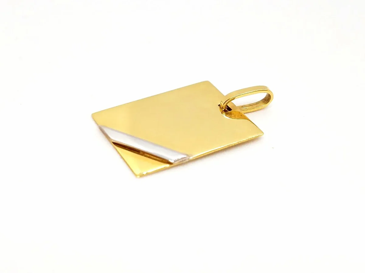 Pendentif en or jaune 750 millièmes (18 carats) testé, plaque rectangulaire avec une bande en or blanc, dimensions plaque: 2 cm x 1,5 cm, épaisseur: 0,03 cm, hauteur bélière incluse: 2,61 cm, poids total: 1,99 g, état neuf