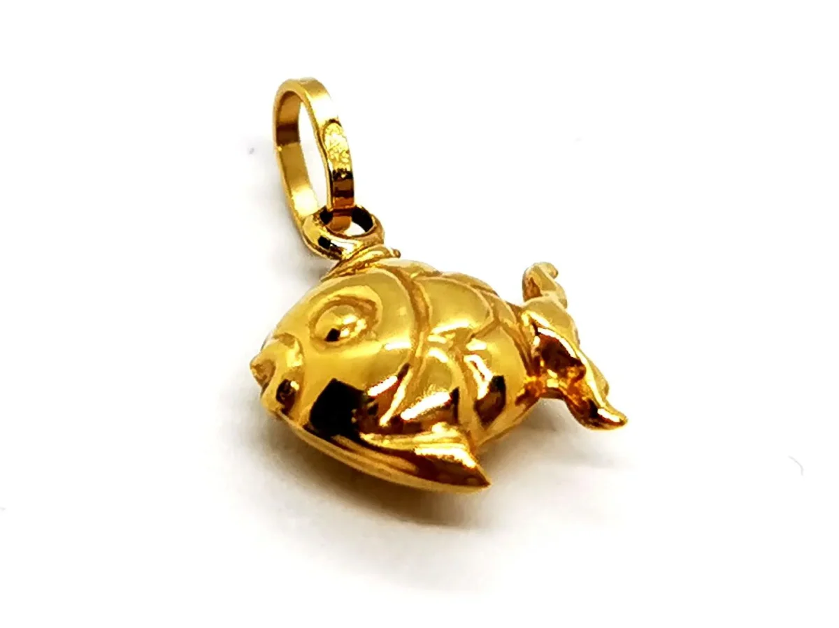 Pendentif poisson, en or jaune 750 millièmes (18 carats) testé, dimensions (bélière incluse): 1,67 cm x 0,95 cm, poids total: 0,49 g, état neuf.