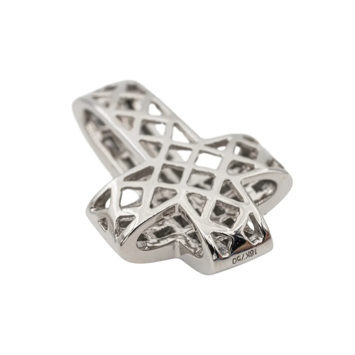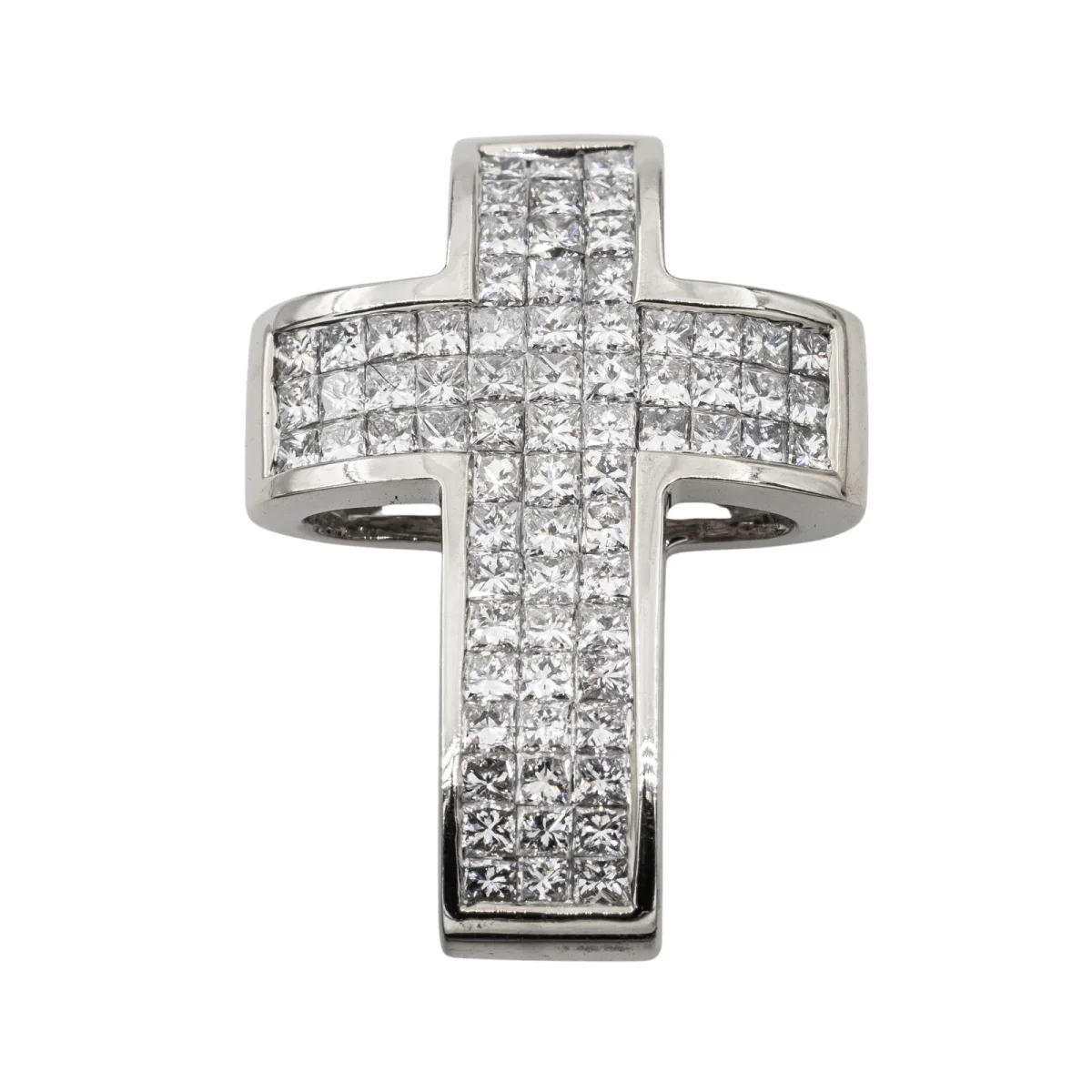 Pendentif croix en or blanc 750 millièmes (18 carats), sertie de 72 diamants diamants taille princesse, environ G-SI, poids total diamants : environ 0,72 ct (chaque diamant pèse environ 0,01 ct), dimension : 2,18 cm x 1,45 cm, poids total : 3,46 g, poinçon hibou, excellent état