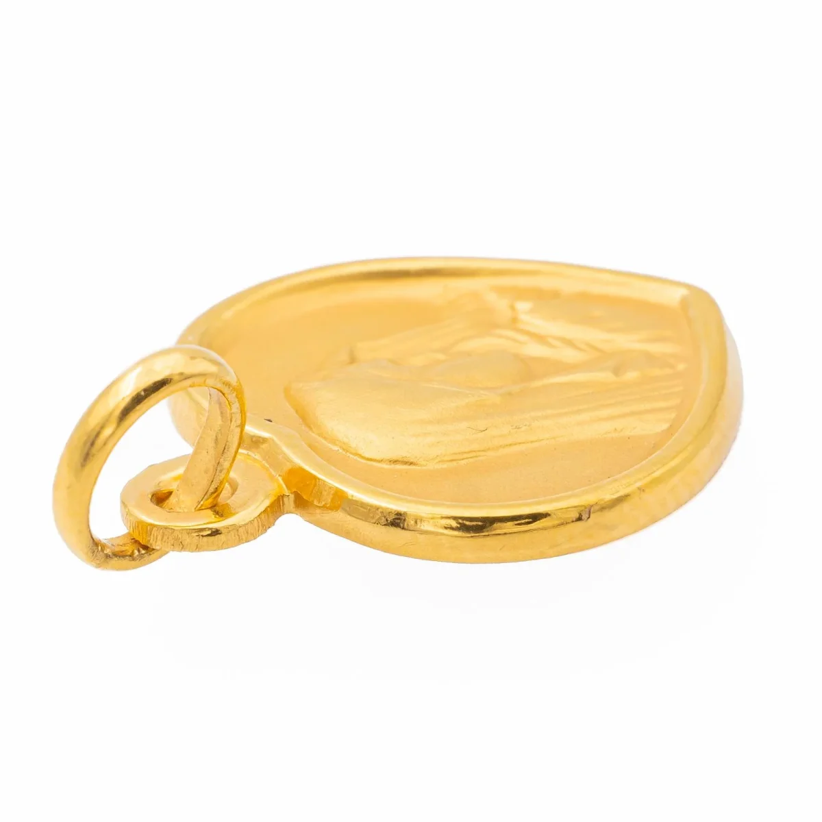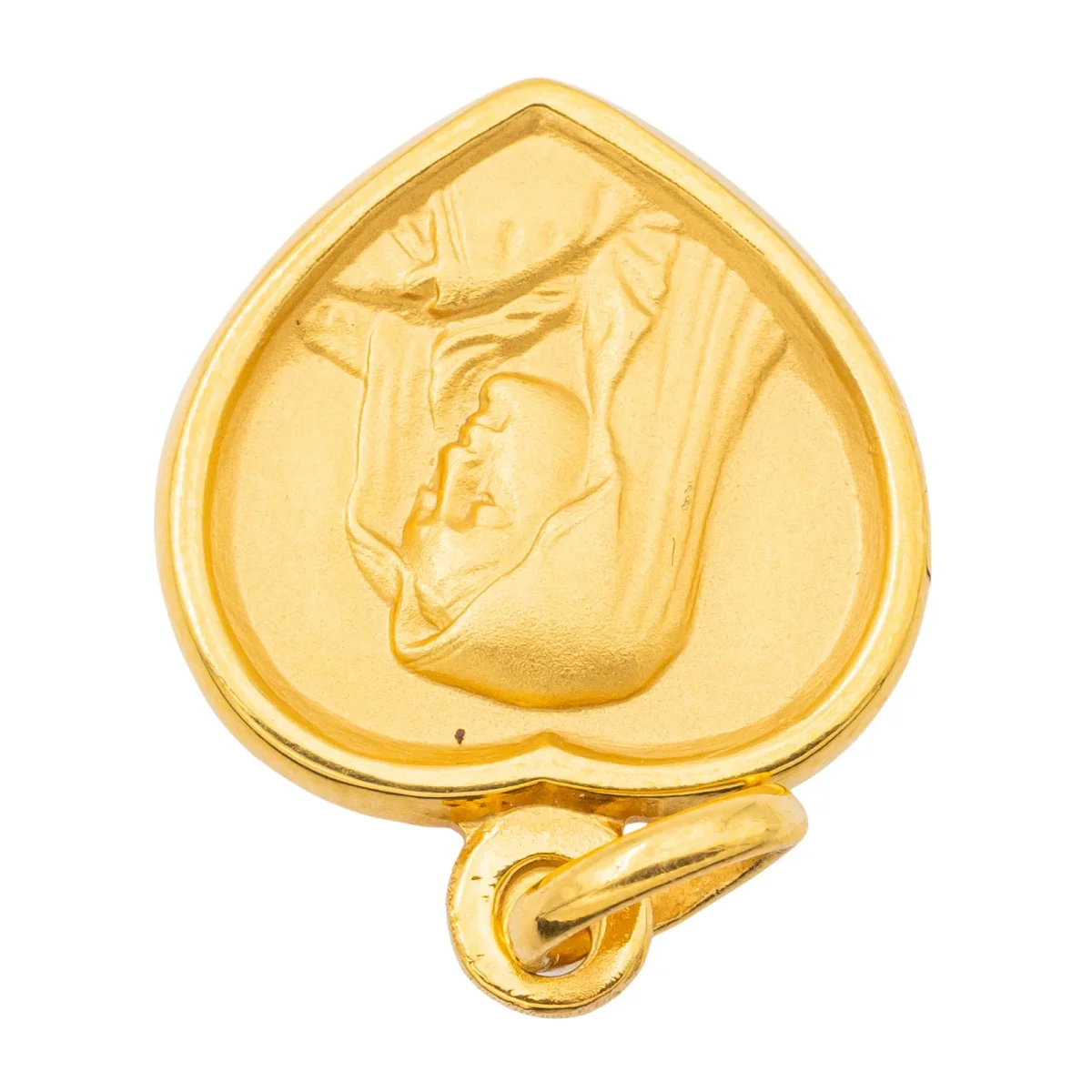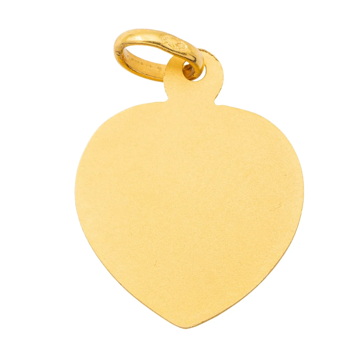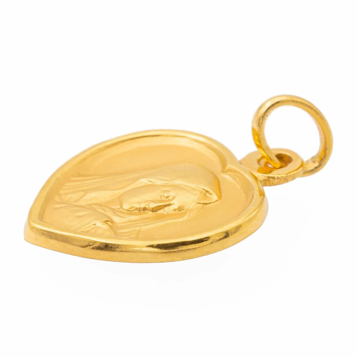 Pendentif médaille religieux, en or jaune 750 millièmes (18 carats) testé, en forme de coeur, figurant la Vierge Marie, dimensions (avec bélière): 2,11 cm X 1,14 cm, poids total: 2,35 g, état neuf.