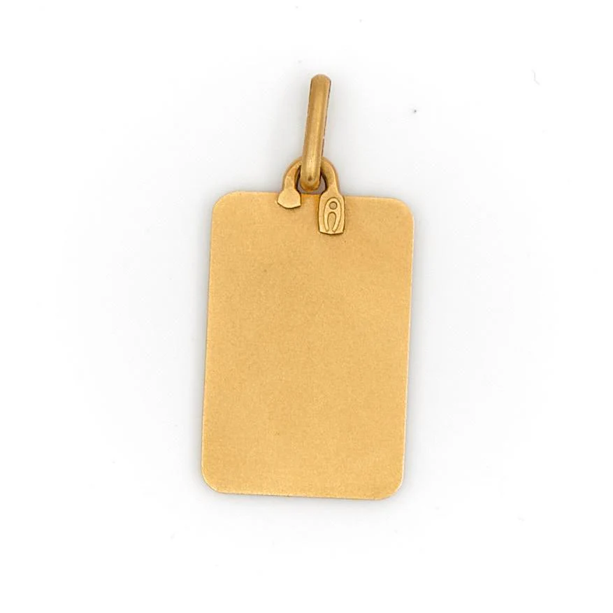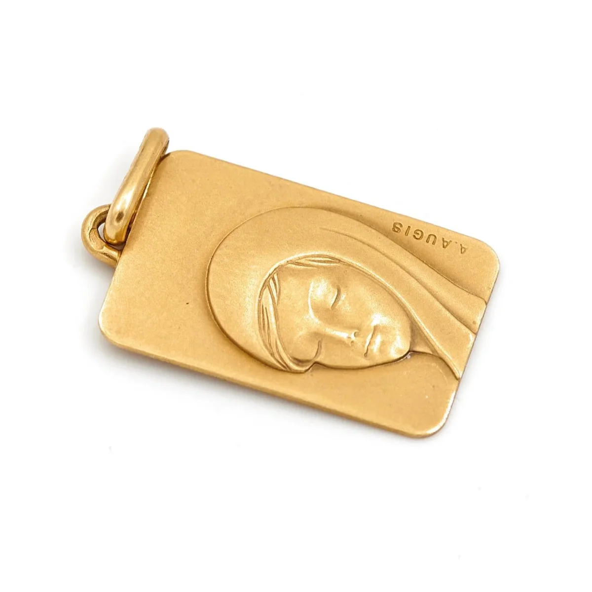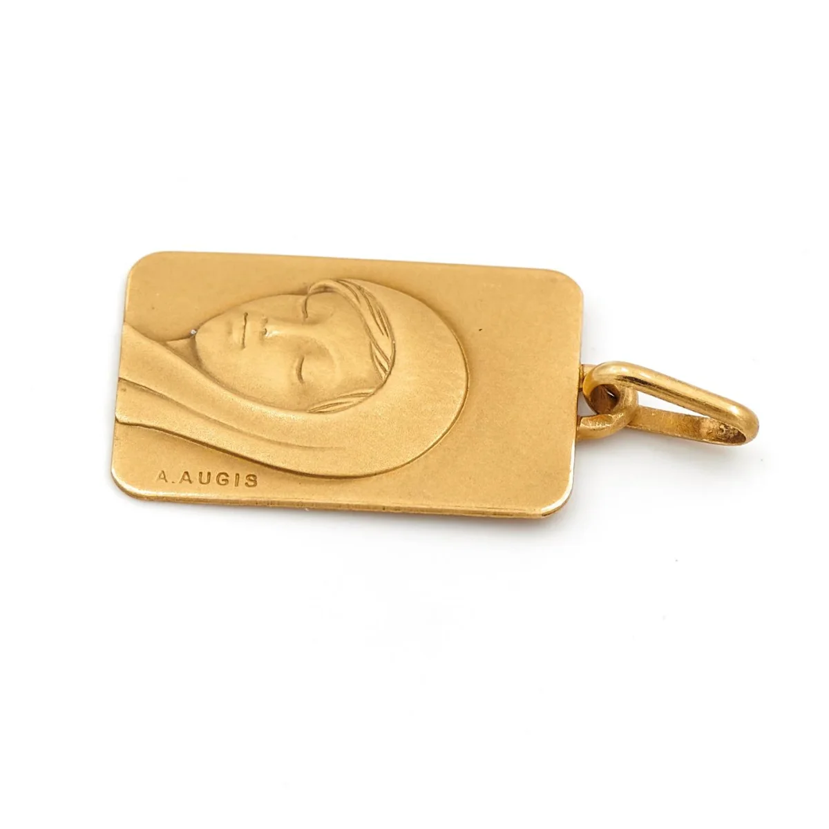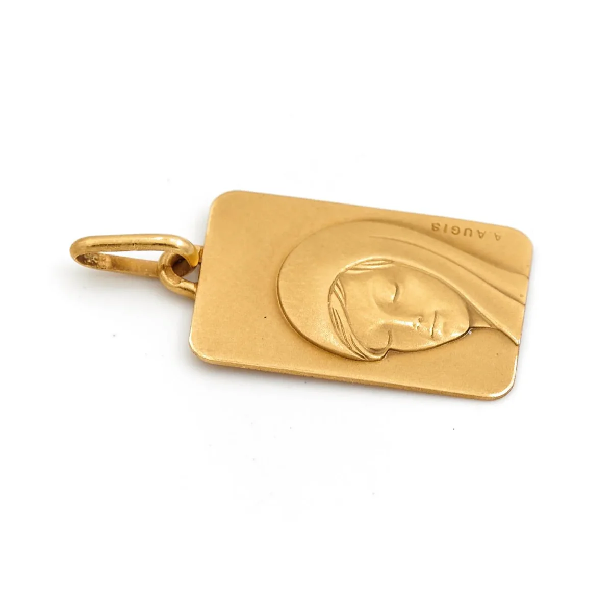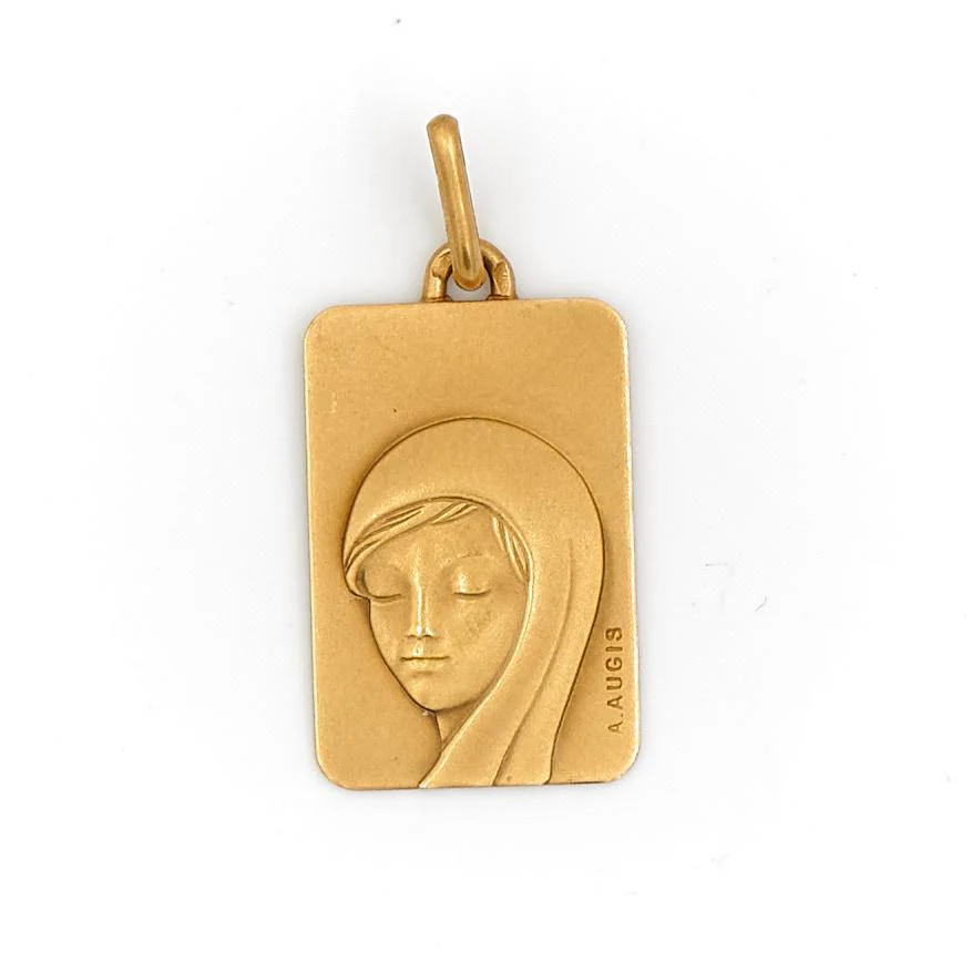 Médaille religieuse rectangulaire en or jaune 750 millièmes (18 carats), Vierge Marie, signée Augis, hauteur: 2,58 cm, largeur: 1,2 cm, poids total: 2,24 g, poinçon tête d’aigle, excellent état