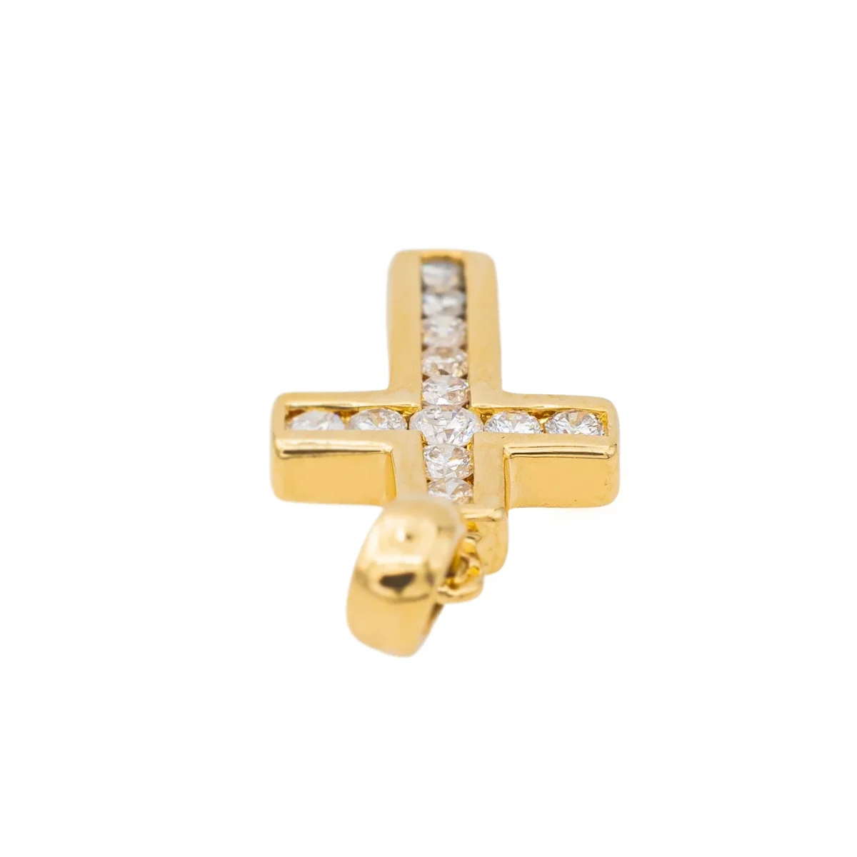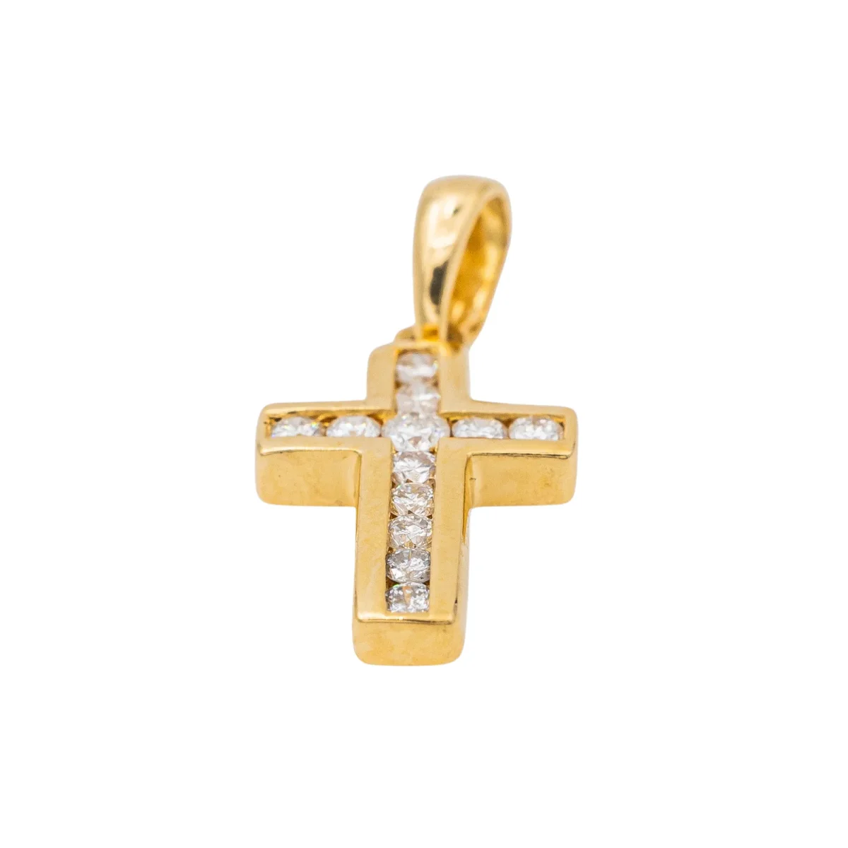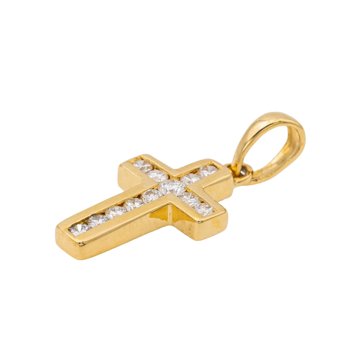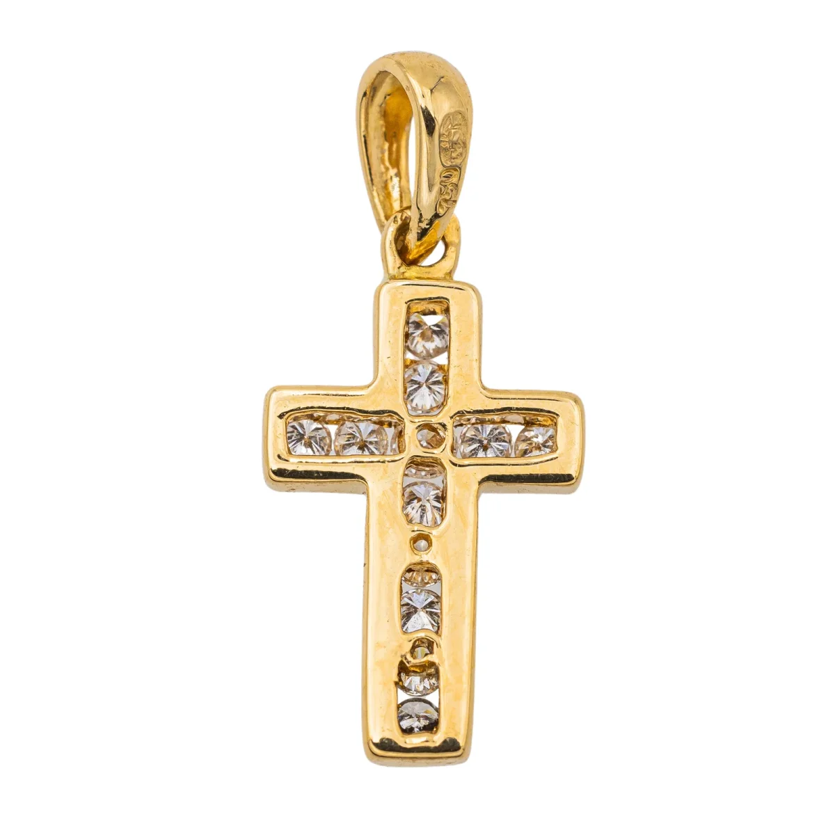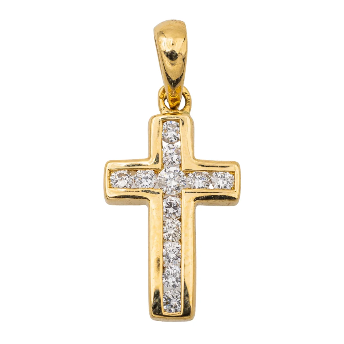 Pendentif croix en or jaune 750 millièmes (18 carats) testé, serti de 12 diamants taille brillant, environ G-SI, d’un poids total d’environ 0,14 ct, (1 diamant d’un poids d’environ 0,03 ct et 11 diamants d’un poids d’environ 0,01 ct), dimensions avec la bélière : 2,00 cm x 0,89 cm, poids total : 1,21 g, excellent état