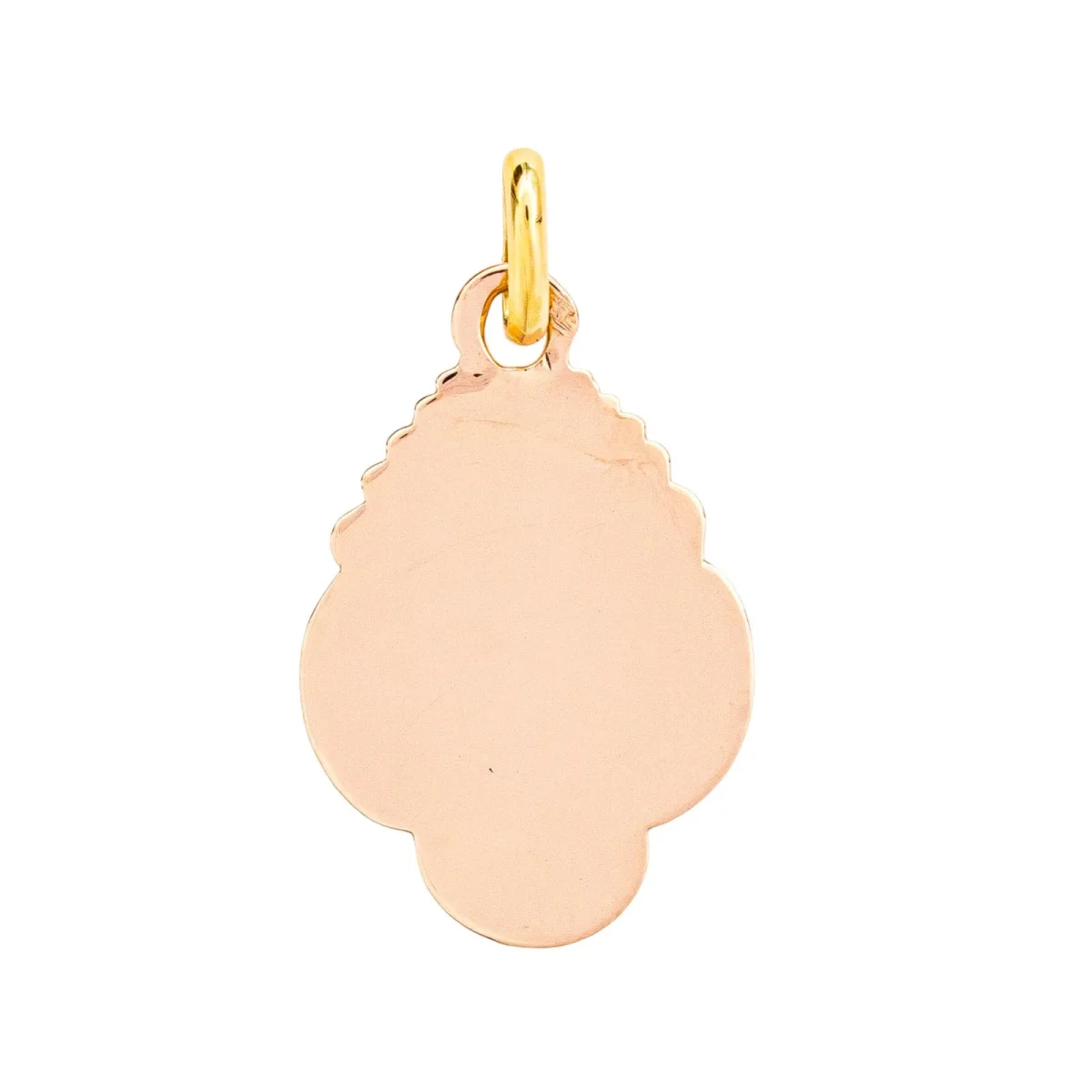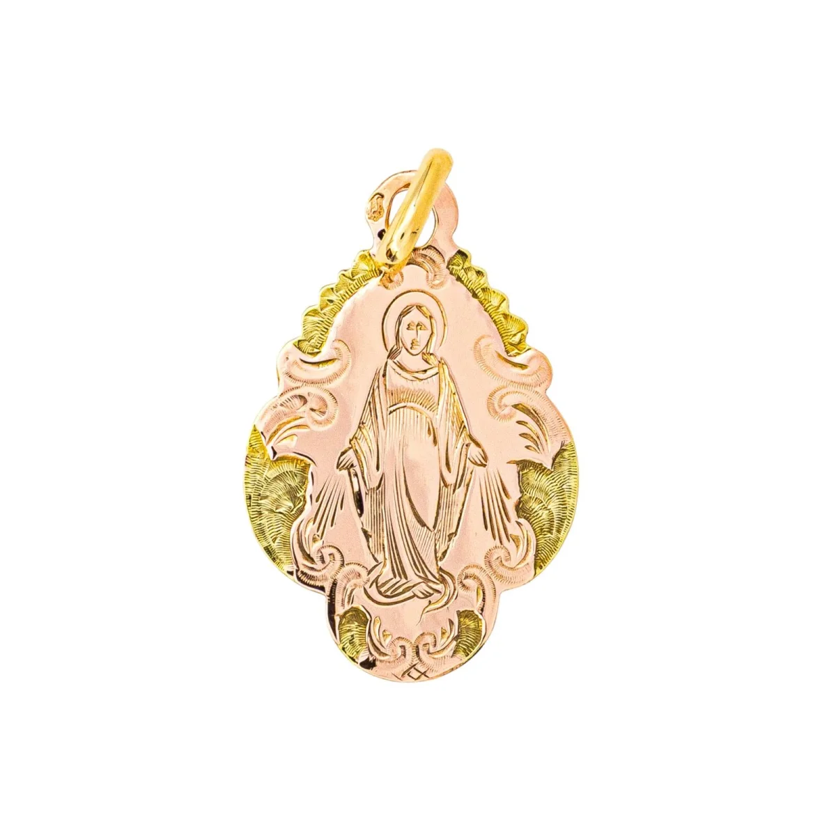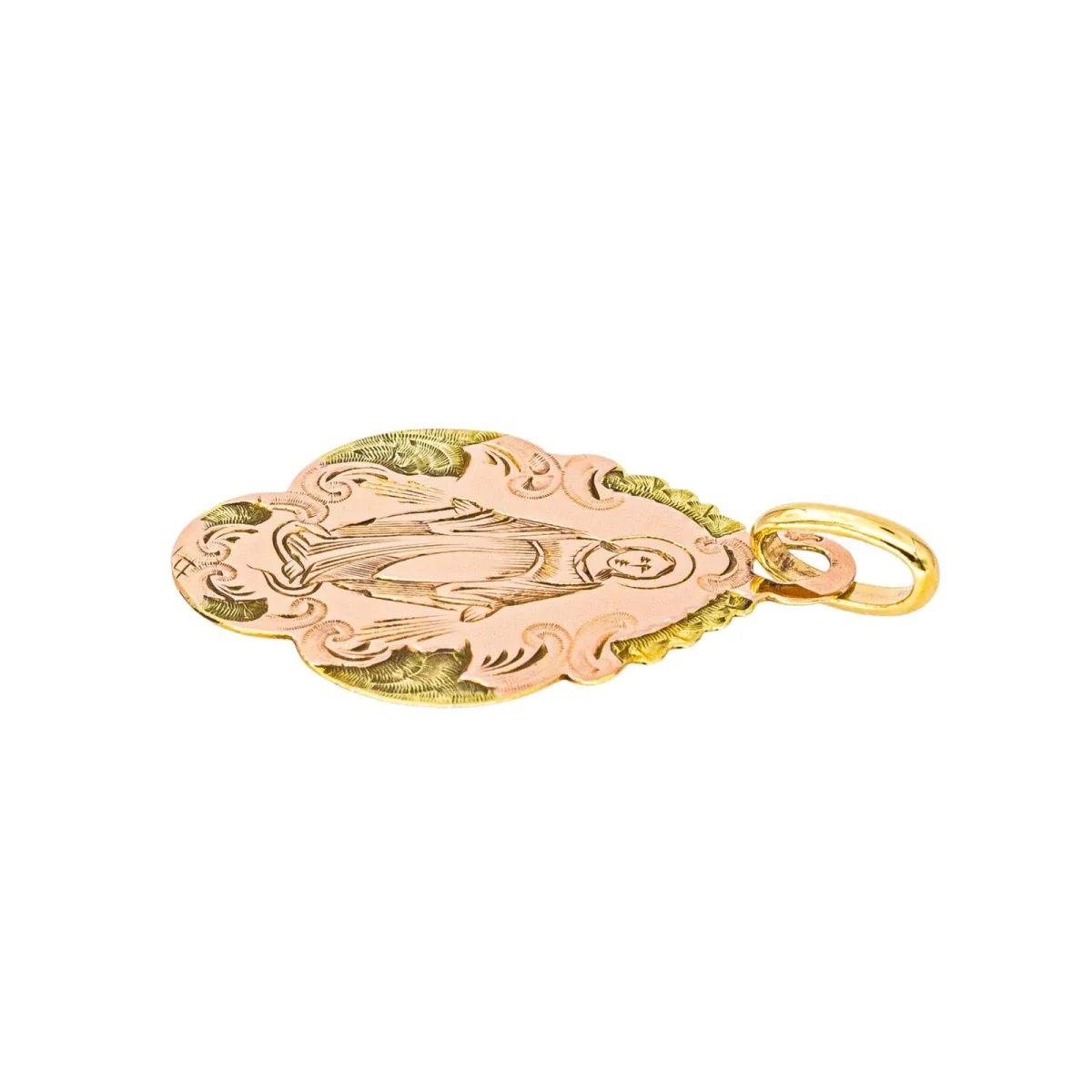 Pendentif religieux en or rose et jaune 750 millièmes (18 carats), figurant la vierge marie, dimensions avec la bélière : 2,60 cm x 1,42 cm, poids total : 0,99 g, poinçon tête d’aigle, bon état