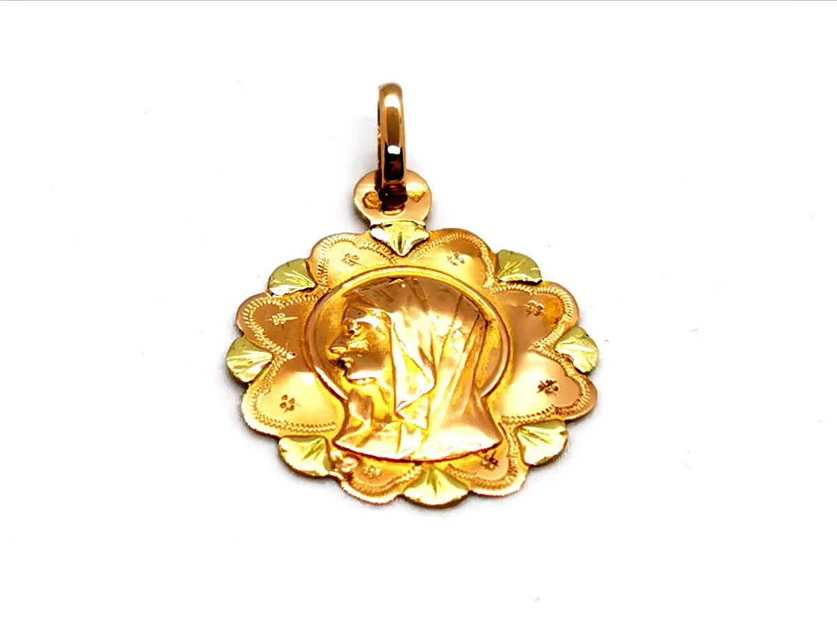 Pendentif en or rose et jaune 750 millièmes (18 carats), médaille religieuse Marie, diamètre: 1,85 cm, hauteur totale (bélière incuse): 2,7 cm, poids total: 1,19 g, poinçon tête d’aigle, excellent état