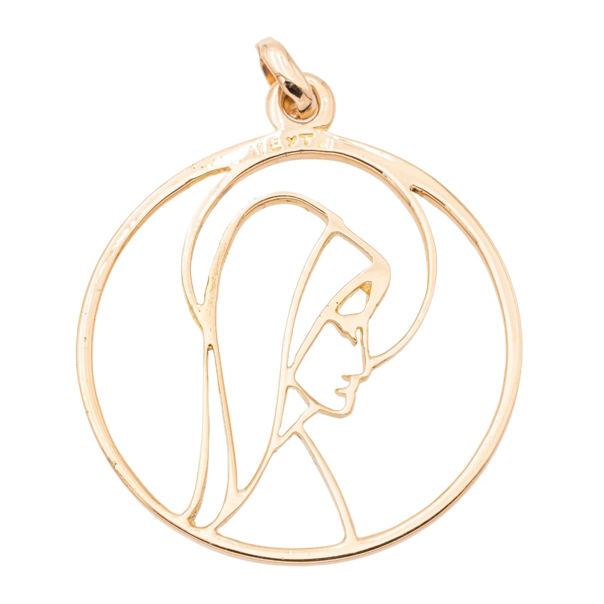 Pendentif religieux en or jaune 750 millièmes (18 carats), figurant la vierge marie ajouré, dimensions avec la bélière: 3,81 cm x 2,91 cm, épaisseur: 0,11 cm, poids total: 3,32 g, poinçon tête d’aigle, excellent état