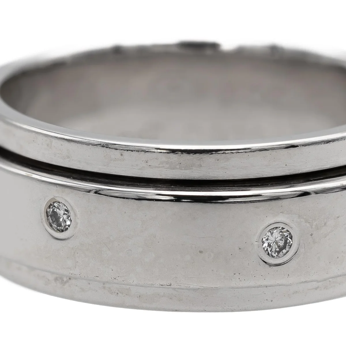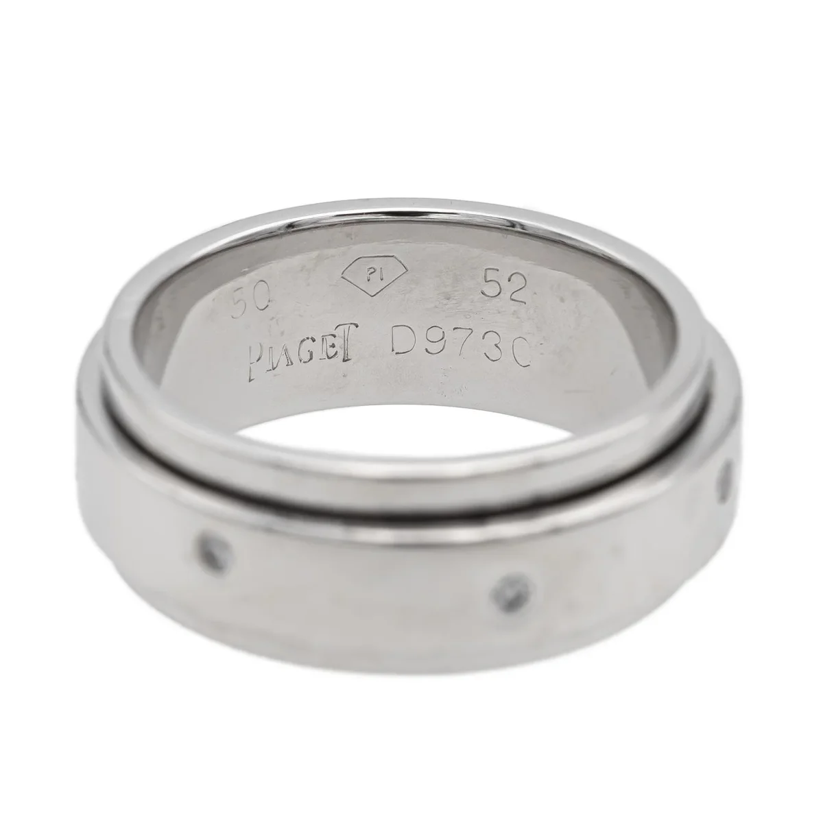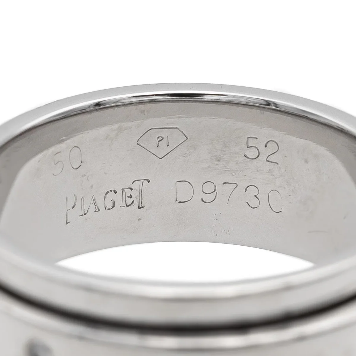 Bague signée de la maison Piaget, collection Possession, en or blanc 750 millièmes (18 carats), anneau mobile, serti de 7 diamants, taille brillant, environ G/VS, pour un total d’environ 0,07 ct, tour de doigt: 52, largeur: 0,72 cm, signée et numérotée: D9730, poids total: 8,74 g, poinçon hibou, Excellent état
