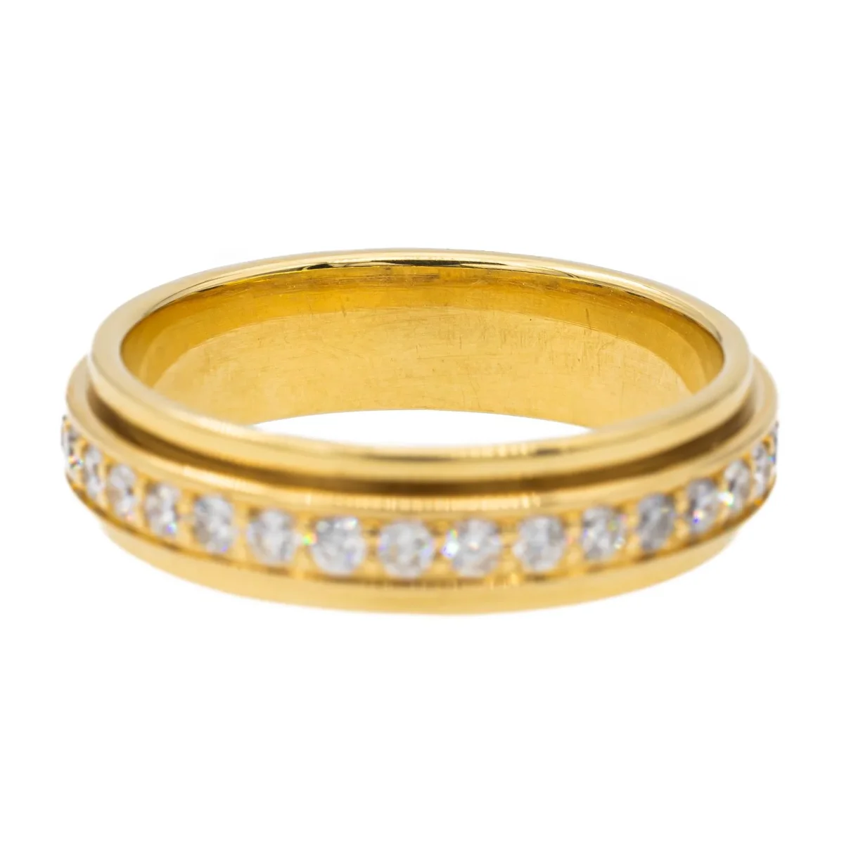 Alliance signée de la Maison Piaget, modèle Possession, en or jaune 750 millièmes (18 carats) testé, sertie de 34 diamants taille brillant estimés H/VS, d’environ 0,02 ct chacun, poids total diamants: environ 0,68 ct, largeur sur le dessus: 0,47 cm, tour de doigt: 49, poids total: 3,84 g, numérotée: B30036, excellent état
