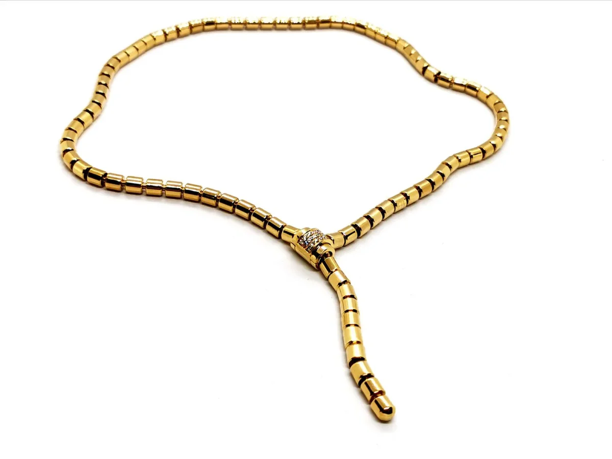 Collier souple Piaget Possession en or jaune 750 millièmes (18 carats) et diamants, composé d’une succession de perles cylindriques rendant le collier entièrement souple et d’un fermoir à clip serti sur le dessus de 20 diamants brillant d’environ 0,01 chacun, environ G/VS, poids total diamants: 0,20 ct, longueur du collier: 53,5cm ajustable sur plusieurs positions, largeur: 0,50 cm, dimensions fermoir: 1,09 cm x 0,92 cm, poids total: 48,86 g, signature Piaget sur le fermoir, numéroté: B98797, poinçon Hibou, excellent état.