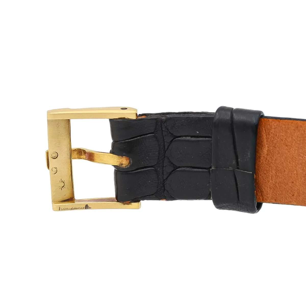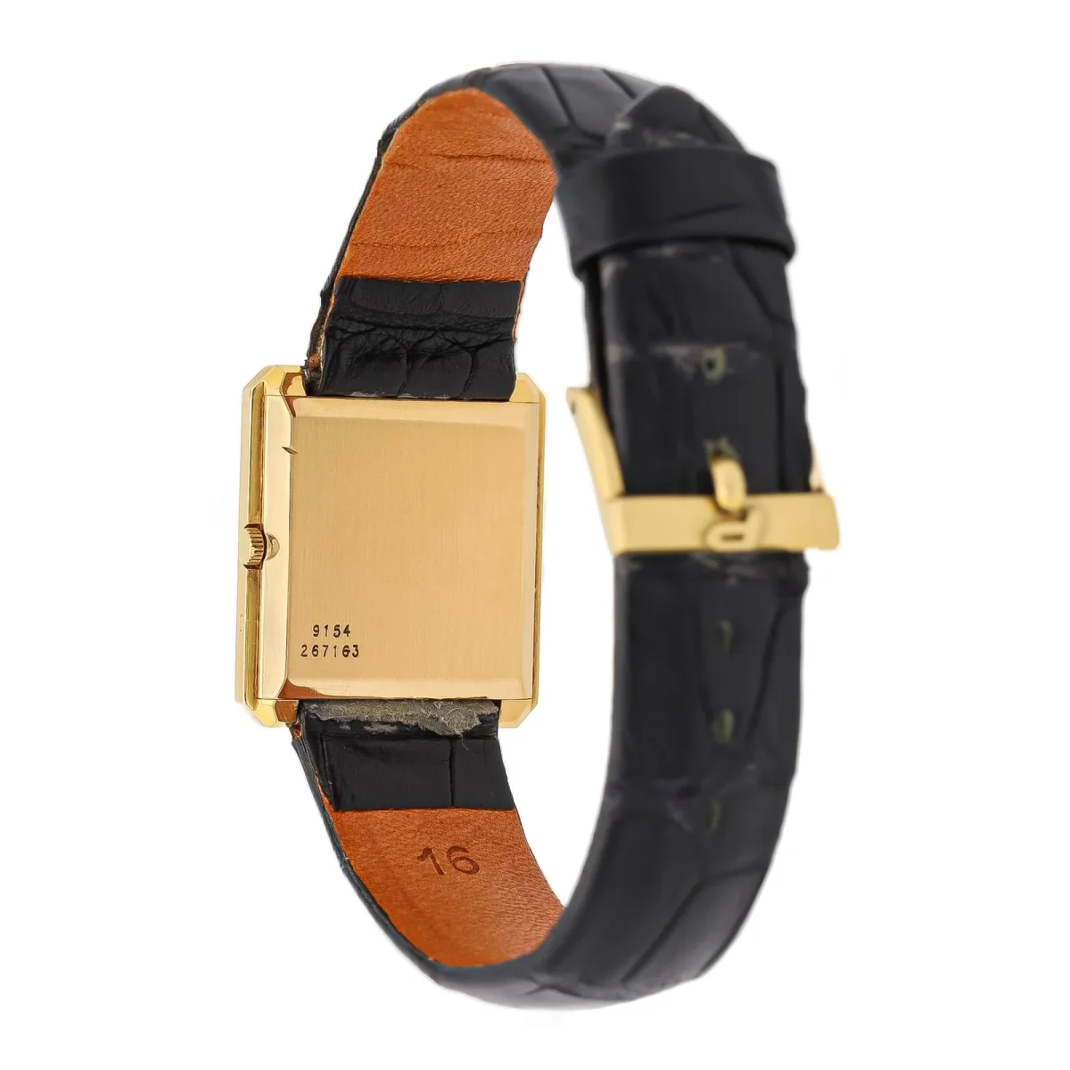 Montre signée de la maison Piaget, mouvement mécanique remontage manuel, boîtier en or jaune 750 millièmes (18 carats), bracelet cuir noir, boîtier rectangulaire: 25 mm x 27 mm, taille poignet: 19 cm, largeur bracelet: 1,5 cm, boucle ardillon, révisée, numérotée: 9154 267163, poids total: 29,88 g, excellent état