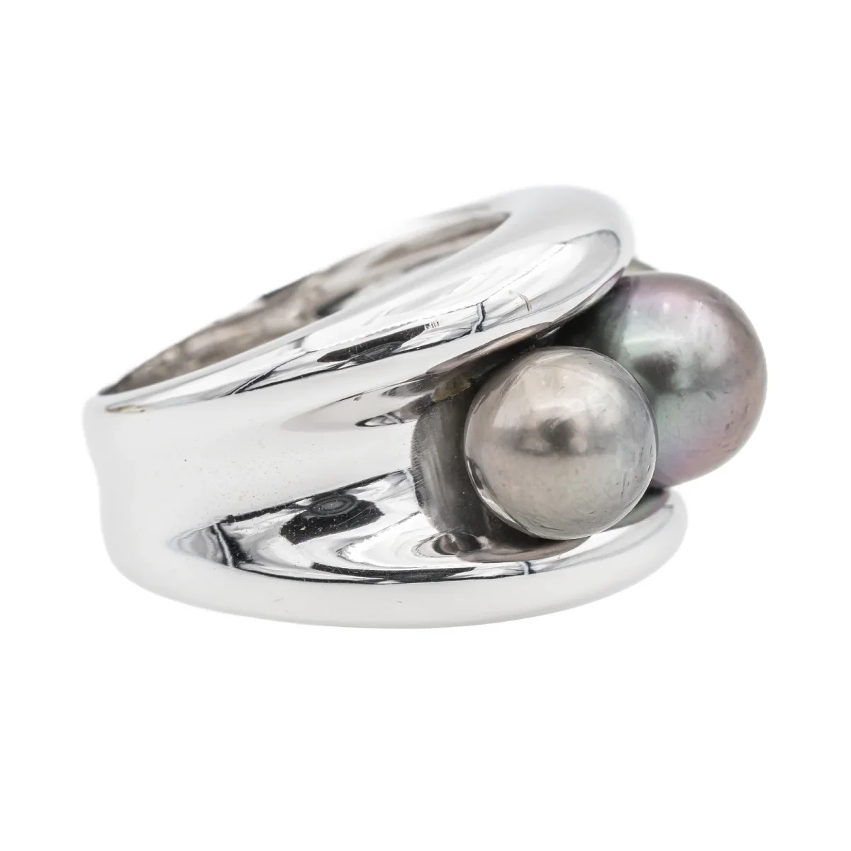Bague signée de la Maison Poiray en or blanc 750 millièmes (18 carats), modèle Fidji, sertie de 3 perles de tahiti, perle centrale de diamètre : 9,10 mm, 2 perles de diamètre : 7,80 mm, largeur sur le dessus : 1,62 cm, tour de doigt : 54, poids total : 22,88 g, poinçon tête d’aigle, vendue avec écrin d’origine et d’époque, numérotée : 79234, excellent état