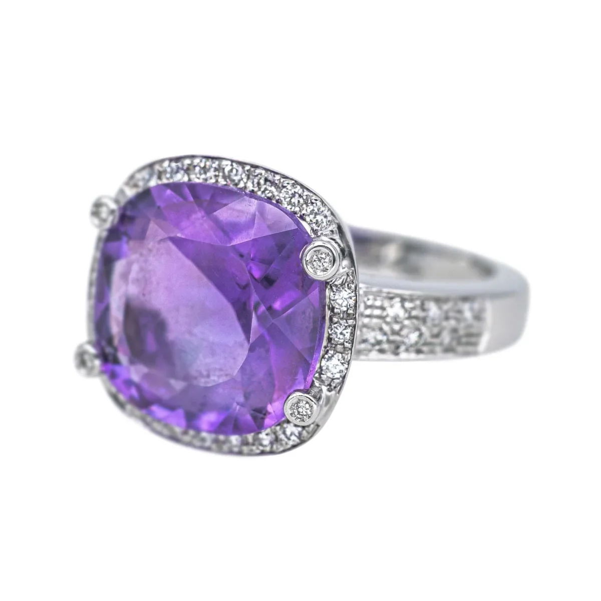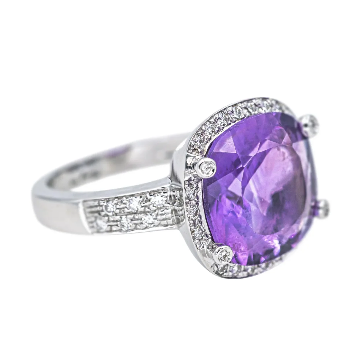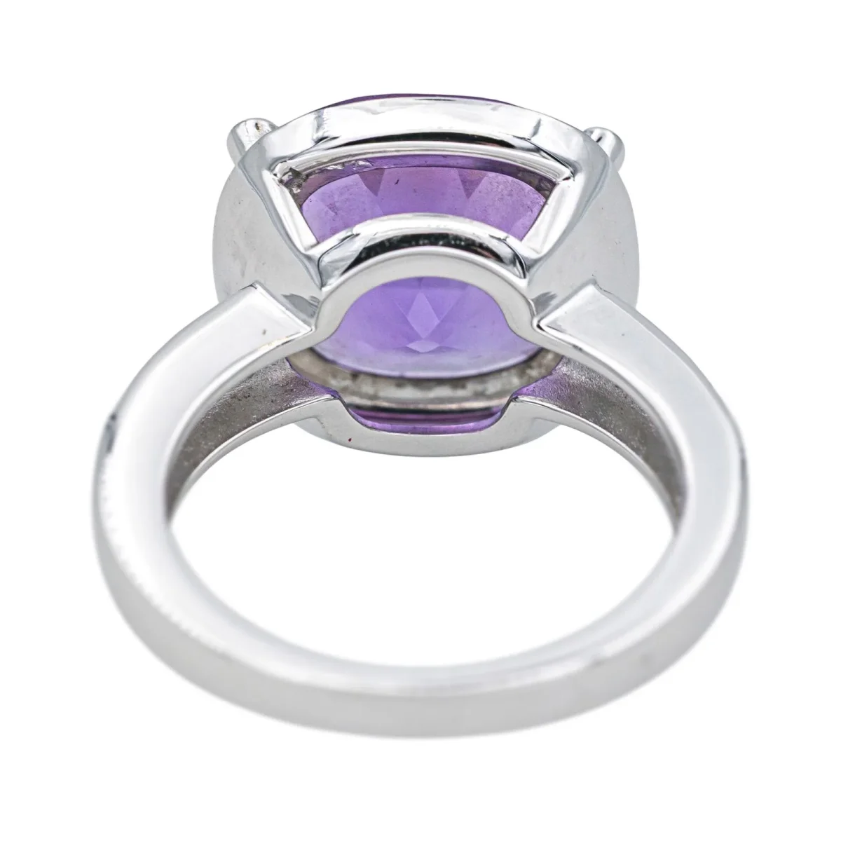 Bague signée de la Maison Poiray en or blanc 750 millièmes (18 carats), modèle Filles Antik, sertie d’une améthyste et de diamants, 1 améthyste taille coussin, d’un poids total d’environ 6 cts, entourée de 35 diamants taille brillant, environ G-VS, d’un poids total d’environ 0,35 ct, (chaque diamant d’un poids d’environ 0,01 ct), largeur sur le dessus : 1,42 cm, tour de doigt : 51, poids total : 7,30 g, poinçon tête d’aigle, vendue avec écrin d’origine et d’époque, numérotée : 34332, excellent état