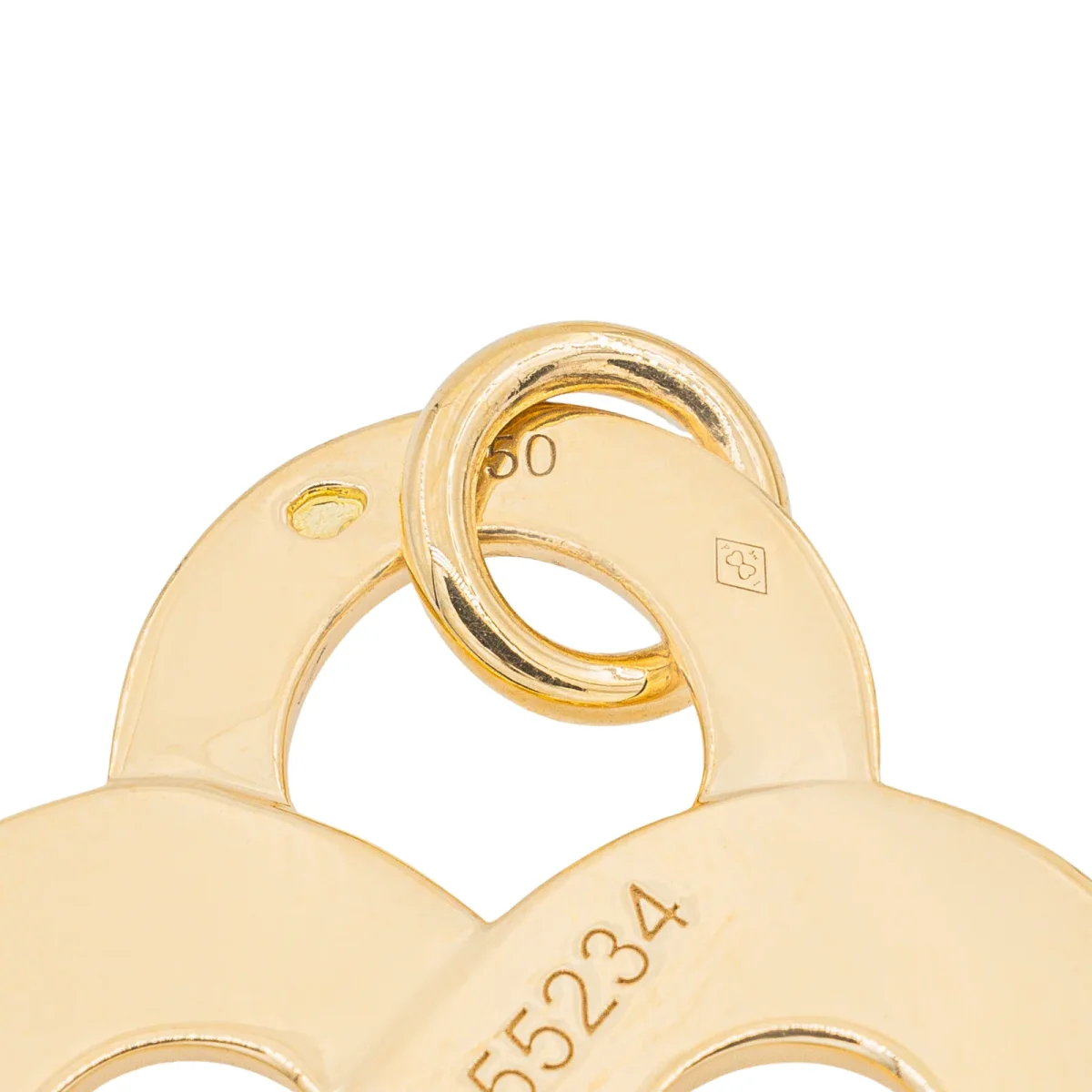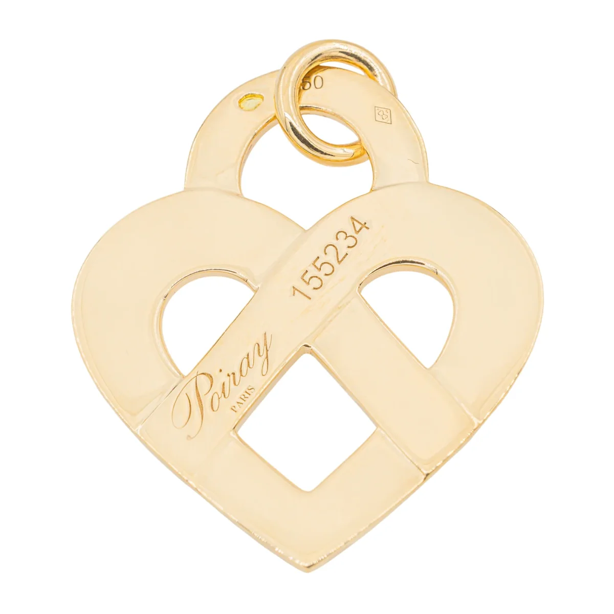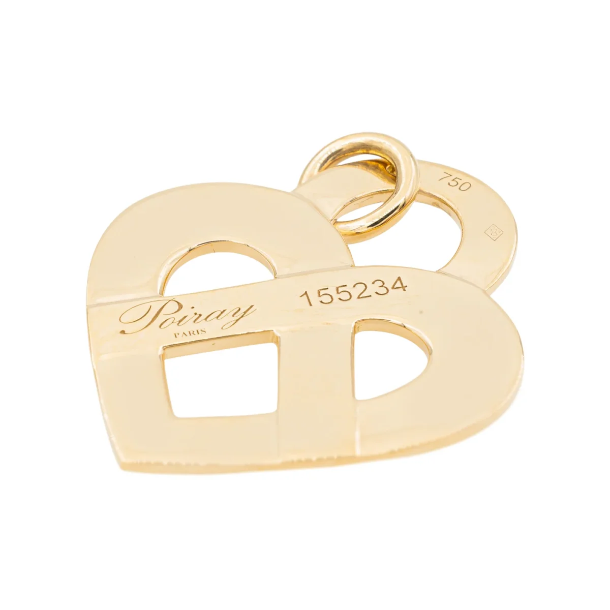 Pendentif signé de la Maison Poiray, en or jaune 750 millièmes (18 carats), modèle » Cœur entrelacé « , longueur 3,20 cm, largeur 2,80 cm, signé et numéroté: 155234, prix neuf: 2680€ poids total 8,46g, poinçon tête d’aigle, excellent état