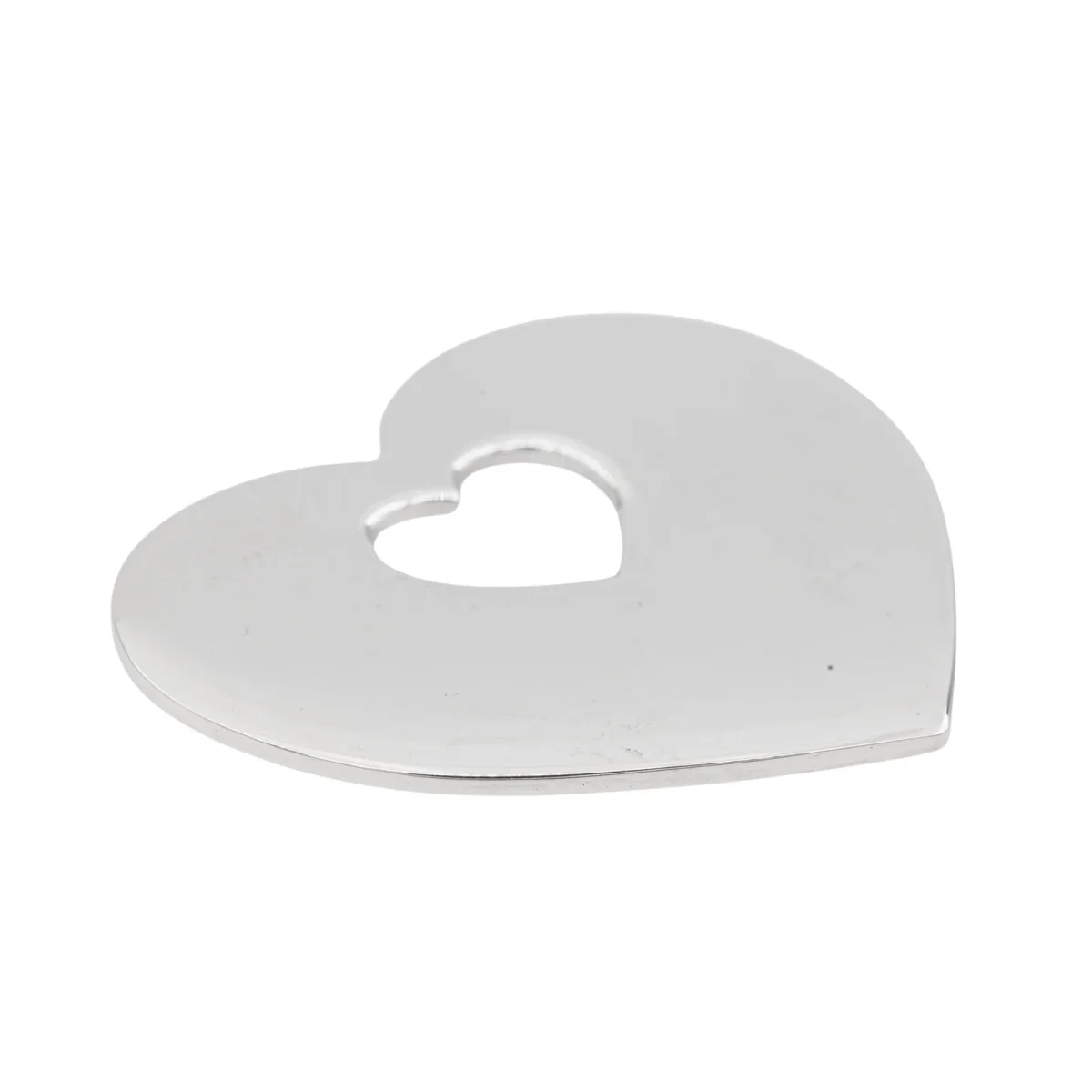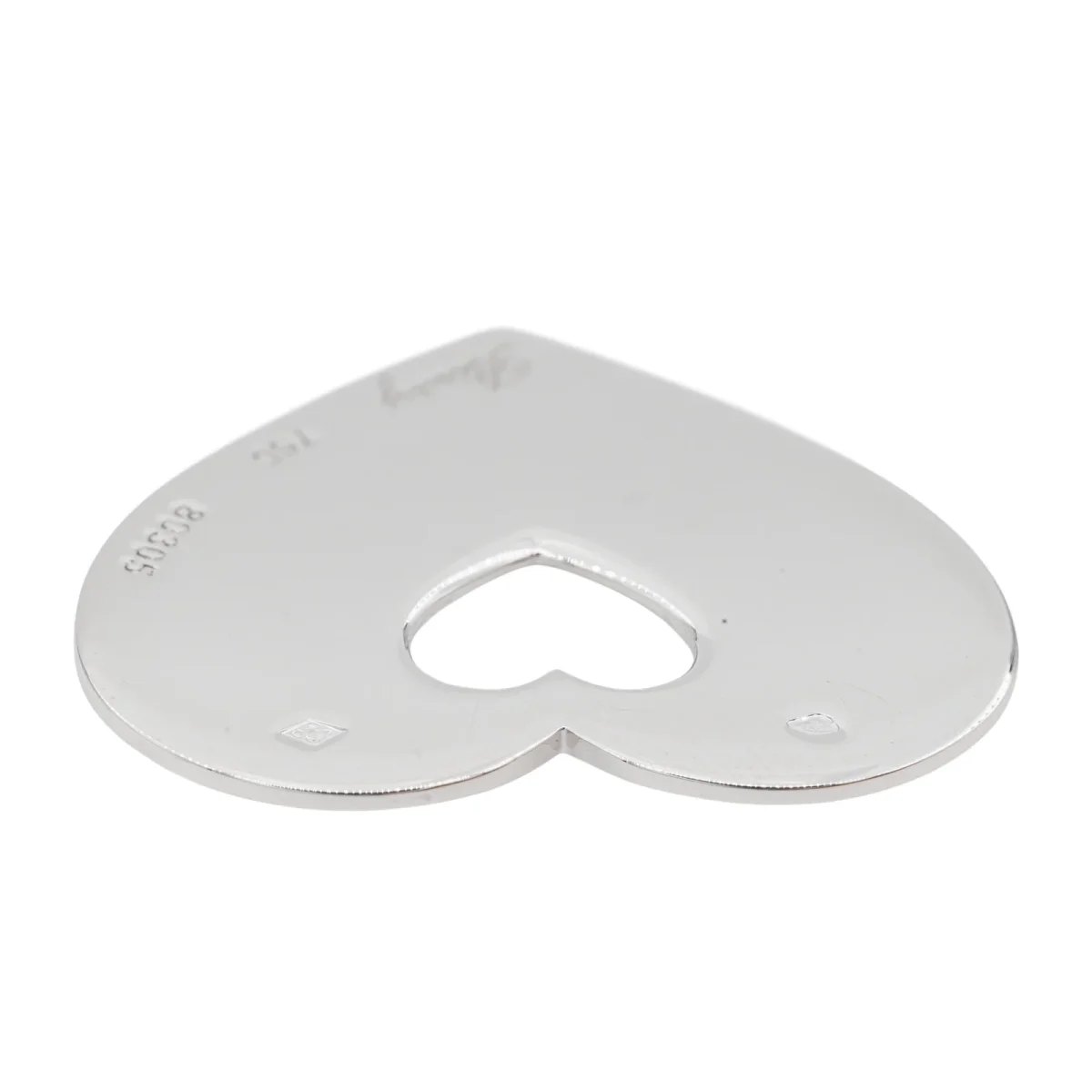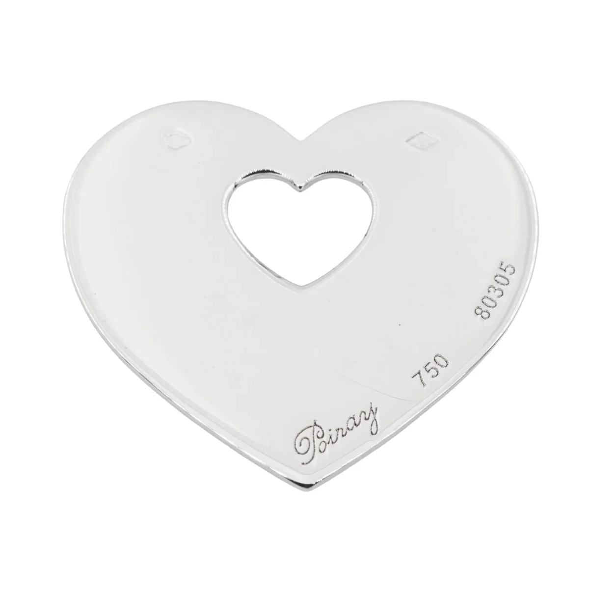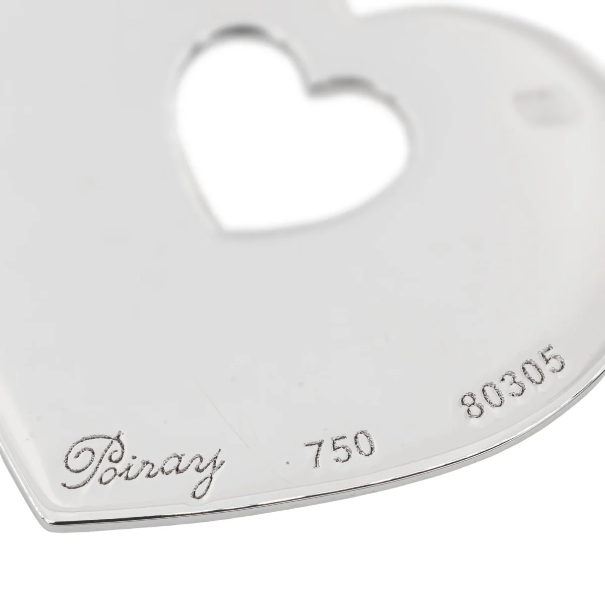 Pendentif signé de la Maison Poiray, en or blanc 750 millièmes (18 carats), modèle coeur ajouré au centre, dimensions: 2,73 cm x 2,43 cm, épaisseur: 0,10 cm, poids total: 6,55 g, poinçon tête d’aigle, numéroté: 80305, excellent état