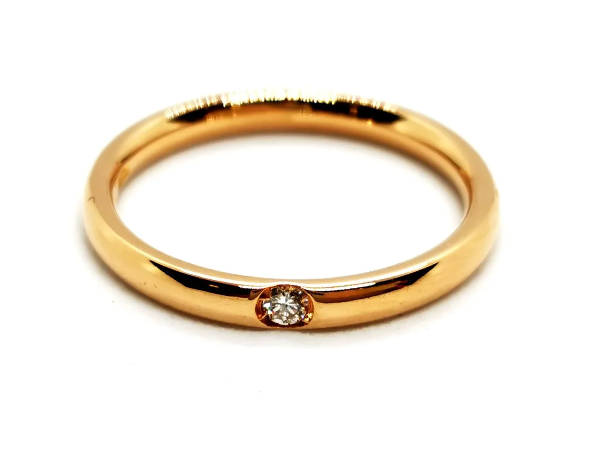 Bague signée de la maison Pomellato, collection Lucciole, en or jaune 750 millièmes (18 carats) testé, sertie d’un diamant, taille brillant G/VS, d’environ 0,03 ct, tour de doigt: 52, largeur sur le dessus: 0,22 cm, poids total: 2,66 g, signée et numérotée: C120062839, prix neuf: 600€, excellent état