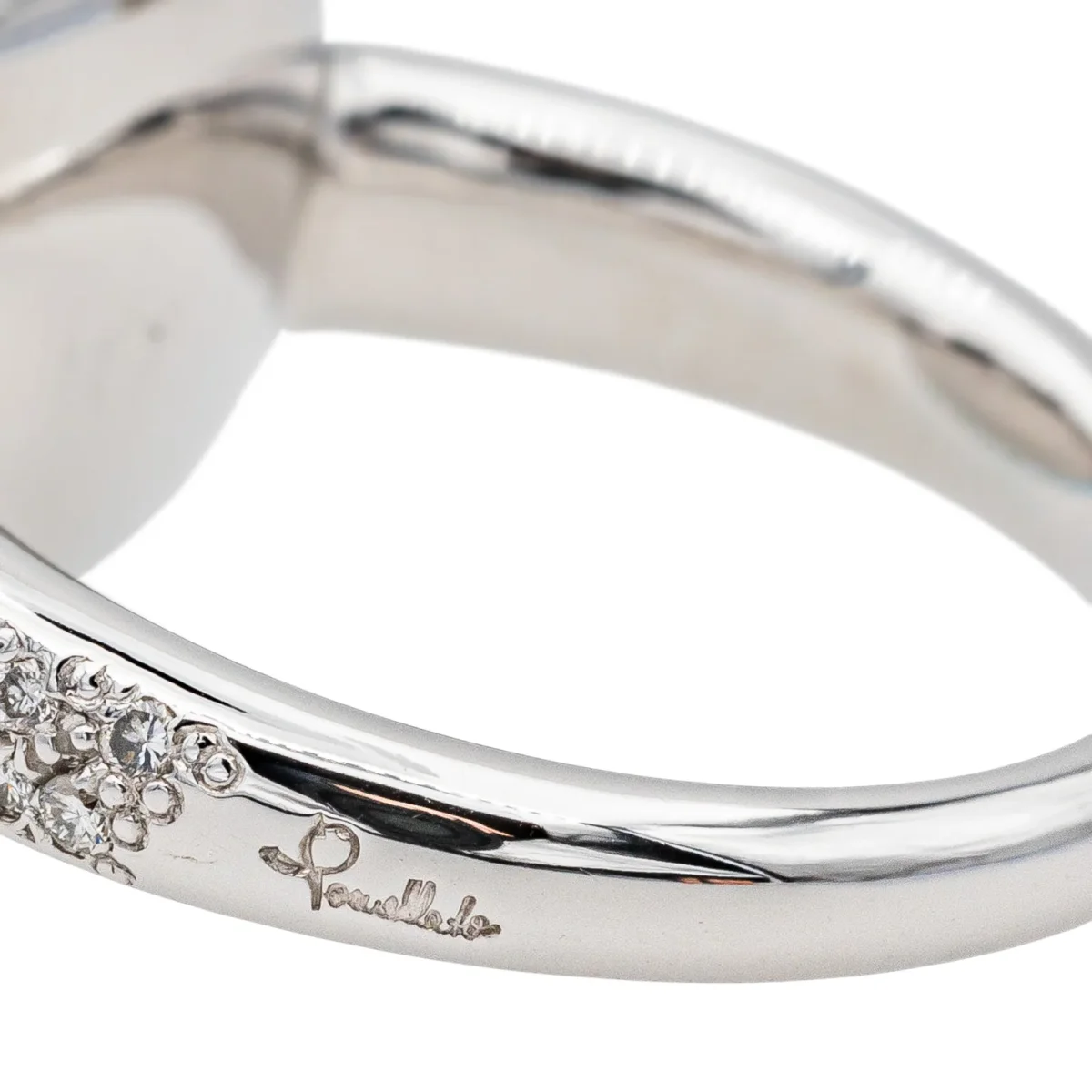 Bague signée de la Maison Pomellato en or blanc 750 millièmes (18 carats), modèle Capri, sertie d’une turquoise et de diamants, une turquoise taille cabochon facetté, d’un poids total d’environ 7,21 cts, entourée de 34 diamants taille brillant, environ G-SI, d’un poids total d’environ 0,17 ct, (chaque diamant d’un poids d’environ 0,005 ct), largeur sur le dessus : 1,27 cm, tour de doigt : 54, poids total : 6,76 g, poinçon tête d’aigle, excellent état