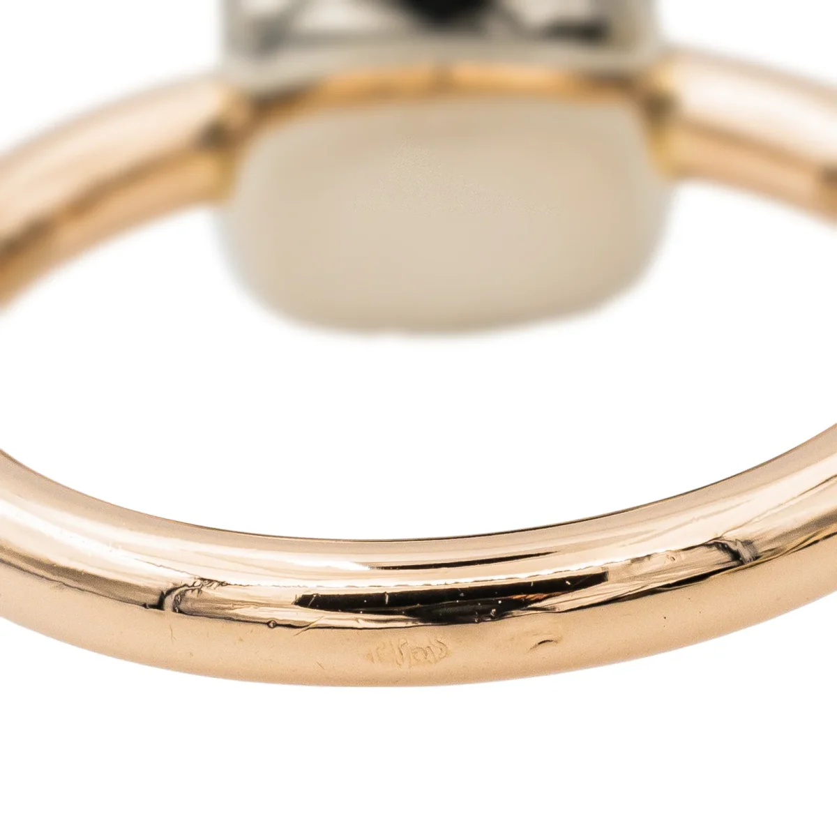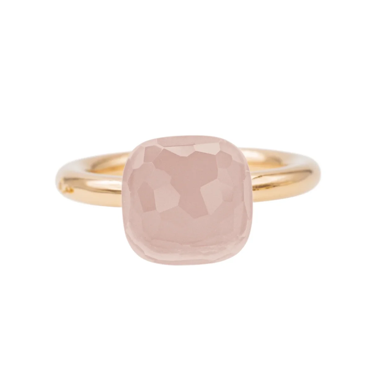 Bague signée de la Maison Pomellato en or rose 750 millièmes (18 carats), modèle Nudo, sertie d’un quartz rose taille cabochon facetté, d’un poids total d’environ 7,00 cts, largeur sur le dessus : 1,03 cm, tour de doigt : 53, poids total : 8,30 g, poinçon tête d’aigle, excellent état